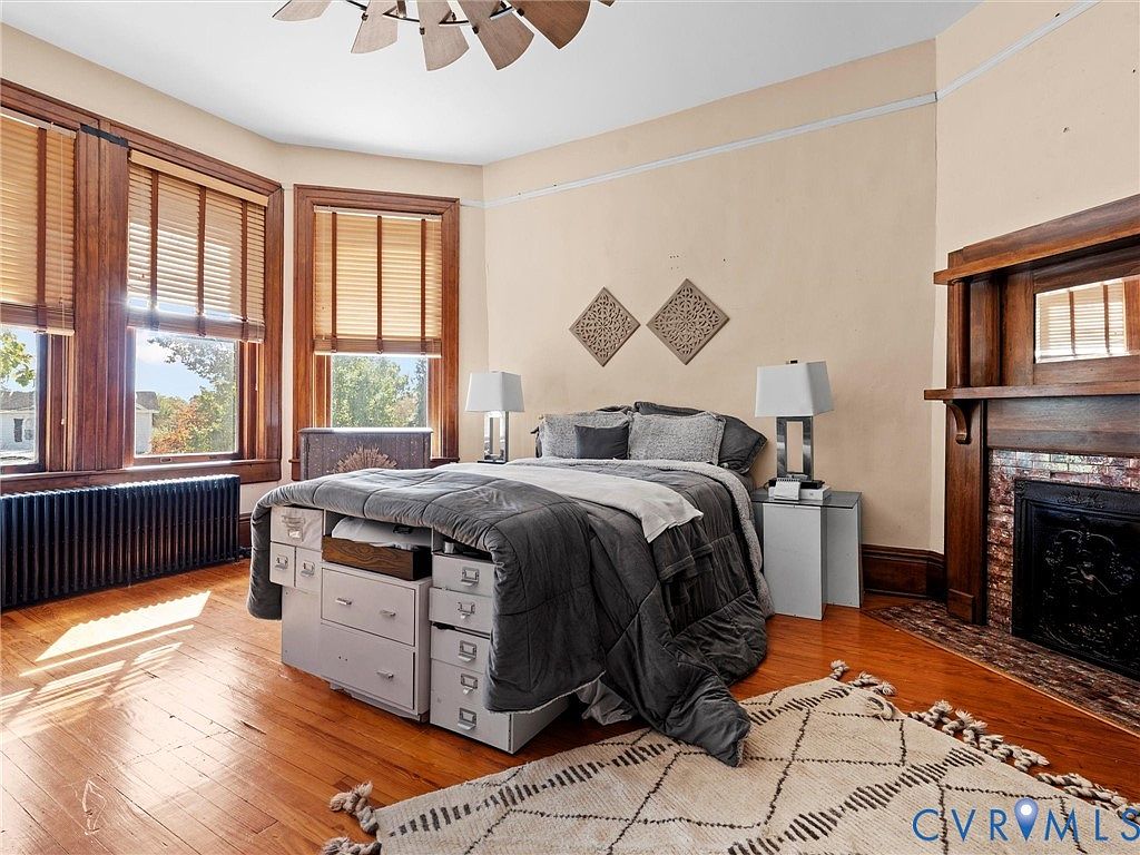 This cozy bedroom features a large bed adorned with plush gray bedding, complemented by an array of decorative pillows. A rustic wooden headboard anchors the bed in front of three elegant bay windows, framed by rich wooden trim that enhances the historic charm. Two bedside tables are strategically placed, with modern lamps providing soft illumination. A unique area rug adds texture beneath the bed, while a decorative patterned piece graces the wall above. The warm honey-toned hardwood floor contrasts beautifully with the softer hues of the walls, while the vintage fireplace adds a focal point to the room.