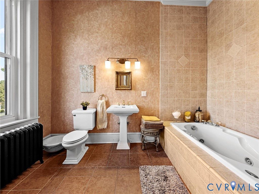 This elegant bathroom features a blend of vintage and modern aesthetics. The walls boast a soft, blush tone, complementing the light beige tile that wraps around the tub area. A vintage white porcelain sink and toilet share space with a luxurious, jetted bathtub. To the left, a cast-iron radiator adds character and warmth. The room is illuminated by stylish wall sconces and natural light streaming through large windows. Decorative elements include a framed artwork and neatly stacked towels, creating a serene and inviting atmosphere. Subtle textures in the rug and furniture enhance the overall charm of this intimate retreat.