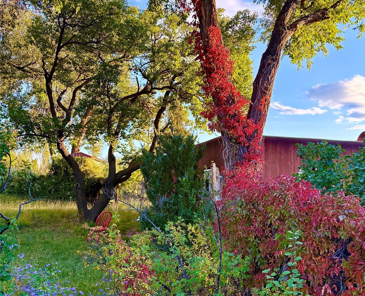 A serene garden space unfolds with towering trees creating a natural canopy. One tree showcases vibrant red foliage, contrasting with lush green leaves around it. A bright red chair sits invitingly on the grass, adding a pop of color against the earthy tones of the surroundings. Various bushes, some tinged with autumn hues, frame the area, while remnants of wildflowers dot the ground, hinting at a lively ecosystem. The background features a rustic, earthy structure, blending harmoniously with the natural elements. Soft sunlight filters through the branches, casting gentle shadows and enhancing the tranquil atmosphere.