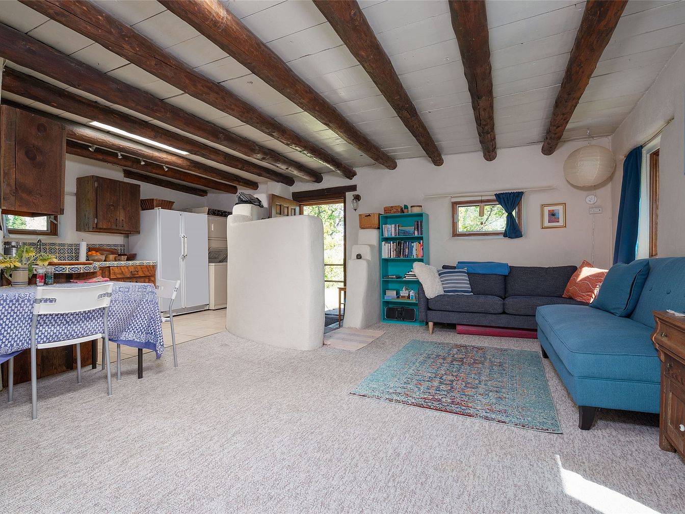 This cozy living room combines rustic charm with modern comfort. Exposed wooden beams span the ceiling, enhancing the warm, earthy atmosphere. A deep blue sectional sofa invites relaxation, while a vibrant area rug adds a touch of color to the neutral carpeted floor. Nearby, a small dining area includes a wooden table draped with a patterned tablecloth, surrounded by simple white chairs. The kitchen features a terracotta tile backsplash, complementing the rich wood cabinetry. Sunlight streams through the windows, illuminating a bookshelf filled with eclectic decor and books, creating a welcoming and lived-in feel.