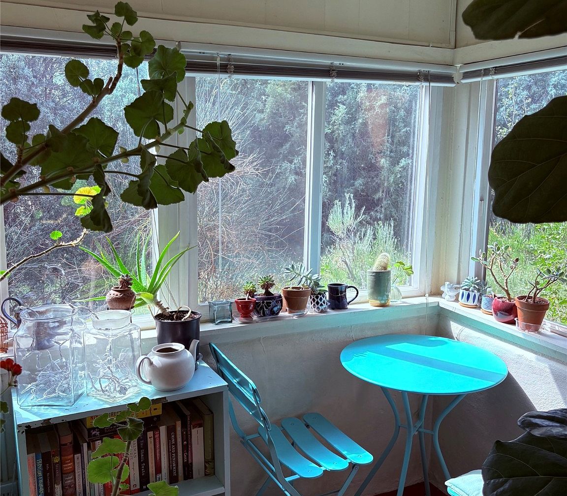 A vibrant sunroom filled with natural light showcases a cozy corner seating arrangement. A round turquoise table complements a matching folding chair, inviting relaxation. Shelves beneath the table hold an assortment of books, adding a personal touch. A variety of potted plants adorn the windowsill, including succulents and aloe vera, enhancing the lively atmosphere. Glass containers capture sunlight, while lush greenery outside enhances the serene view. The warm white walls and colorful ceramics create a harmonious balance, making this sun-filled space both refreshing and tranquil, perfect for enjoying a cup of coffee amidst nature.