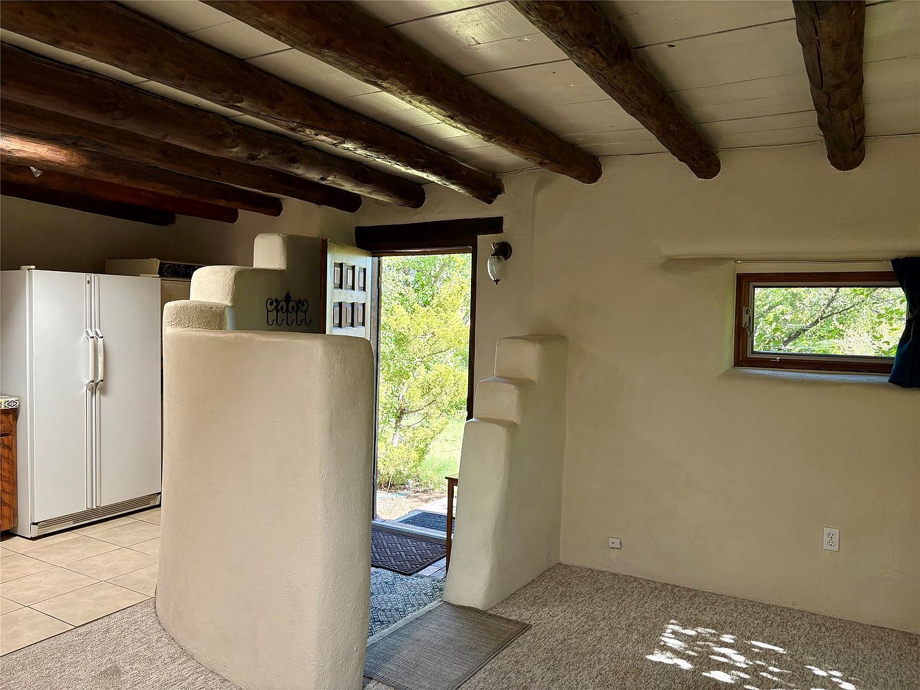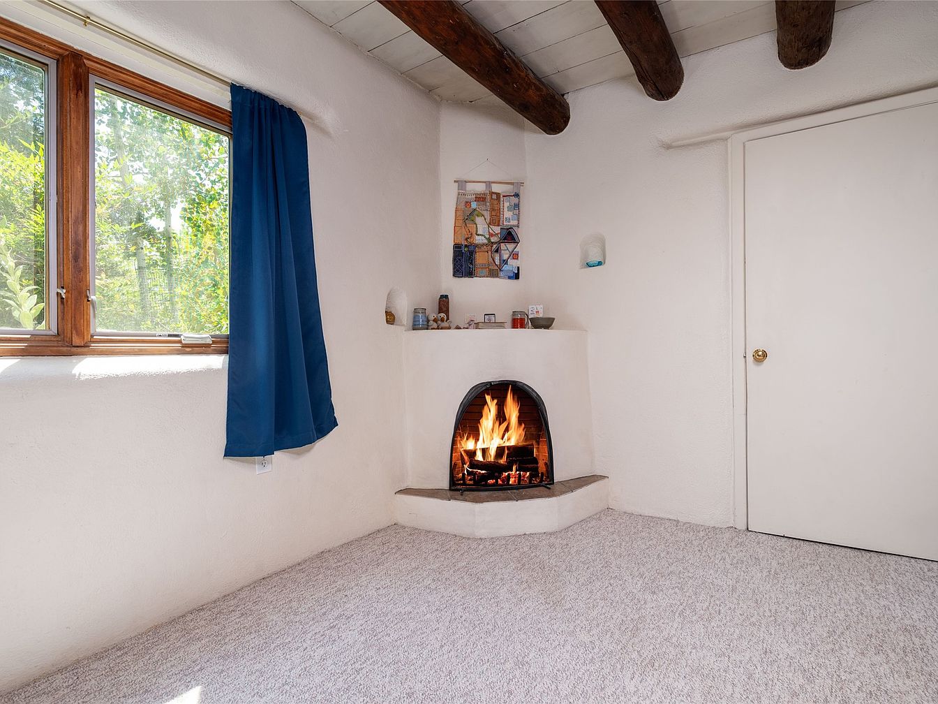 A warm, inviting corner of the room features a traditional fireplace with an arched opening, set into a smooth, white adobe wall. Above the fireplace, light decor elements are arranged, adding personal touches. On the adjacent wall, a plain white door is symmetrically positioned, enhancing the simplicity of the space. Natural light floods in through a wooden-framed window adorned with a deep blue curtain, contrasting with the bright wall. Exposed wooden beams stretch across the ceiling, lending rustic charm. The plush, light-colored carpet enhances comfort, creating a tranquil atmosphere ideal for relaxation.