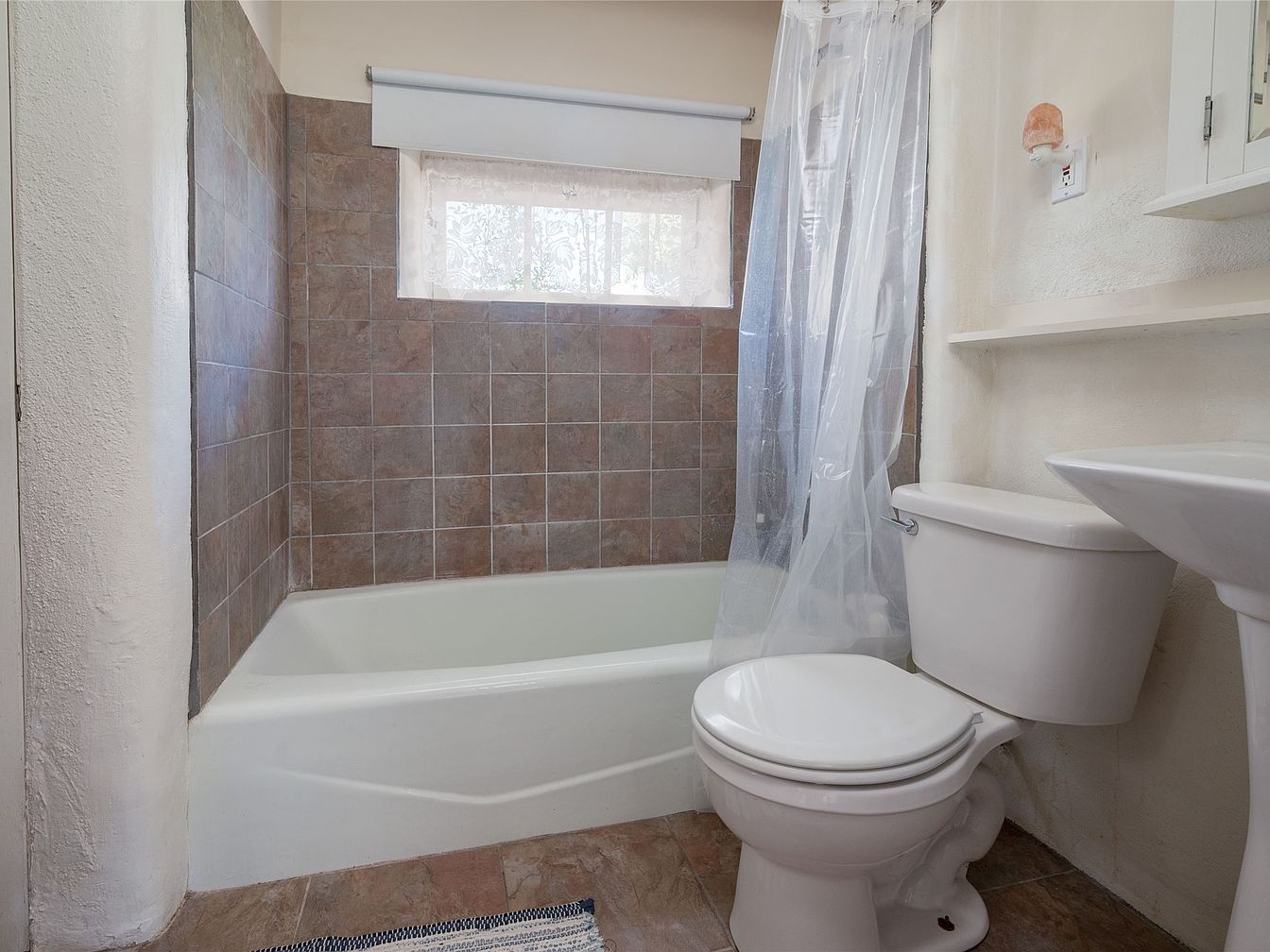 A compact bathroom features a clean layout with a combination of functional and minimalist design elements. The color scheme includes earthy tones with brown tiled walls, enhancing the warm atmosphere. A white bathtub with a smooth surface contrasts against the tile, creating a focal point. The clear shower curtain allows natural light to filter through the window adorned with sheer fabric, maintaining privacy while brightening the space. A white pedestal sink and toilet further complement the aesthetic, emphasizing simplicity. Shelving above the sink provides practical storage, while a small decorative element adds a hint of personality to the overall design.