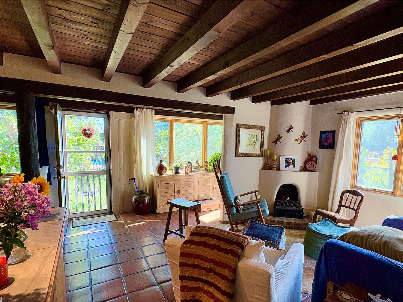 A cozy living room features rustic wooden beams overhead and terracotta tiled flooring. Sunlight pours through large windows, illuminating the space and highlighting the natural textures of the walls and furniture. A mix of seating options includes a white sofa with colorful throw pillows and two vintage wooden chairs, one upholstered in a calming blue. The furnishings are accented by a low wooden cabinet, adorned with decorative vases and cherished artwork. Fresh flowers in a nearby vase add a vibrant touch. The overall atmosphere is inviting and warm, showcasing a perfect blend of comfort and homely charm.