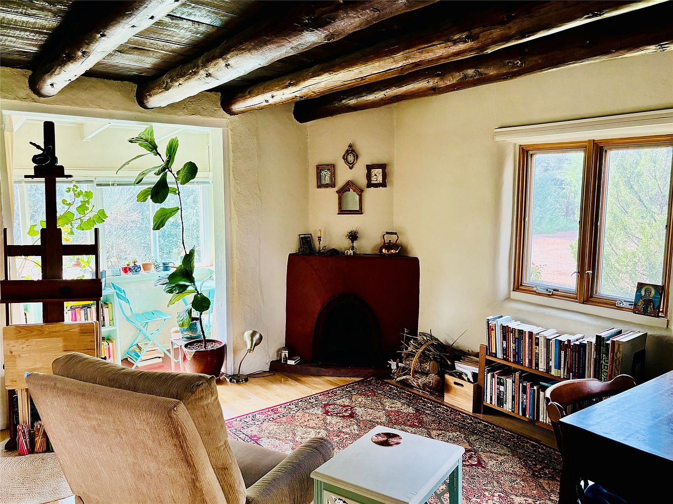 This cozy living room features exposed wooden beams that add rustic charm to the space. Soft beige walls complement a richly patterned area rug, anchoring the room’s inviting atmosphere. A comfortable armchair is positioned near an open floor plan, enhancing sociability. A small white table sits between the chair and a vibrant houseplant, showcasing green foliage. A quaint maroon fireplace, accented with decorative items, creates a focal point opposite a well-stocked wooden bookshelf filled with books. Large windows allow natural light to flood the room, offering views of the outdoors and enhancing the serene ambiance throughout.