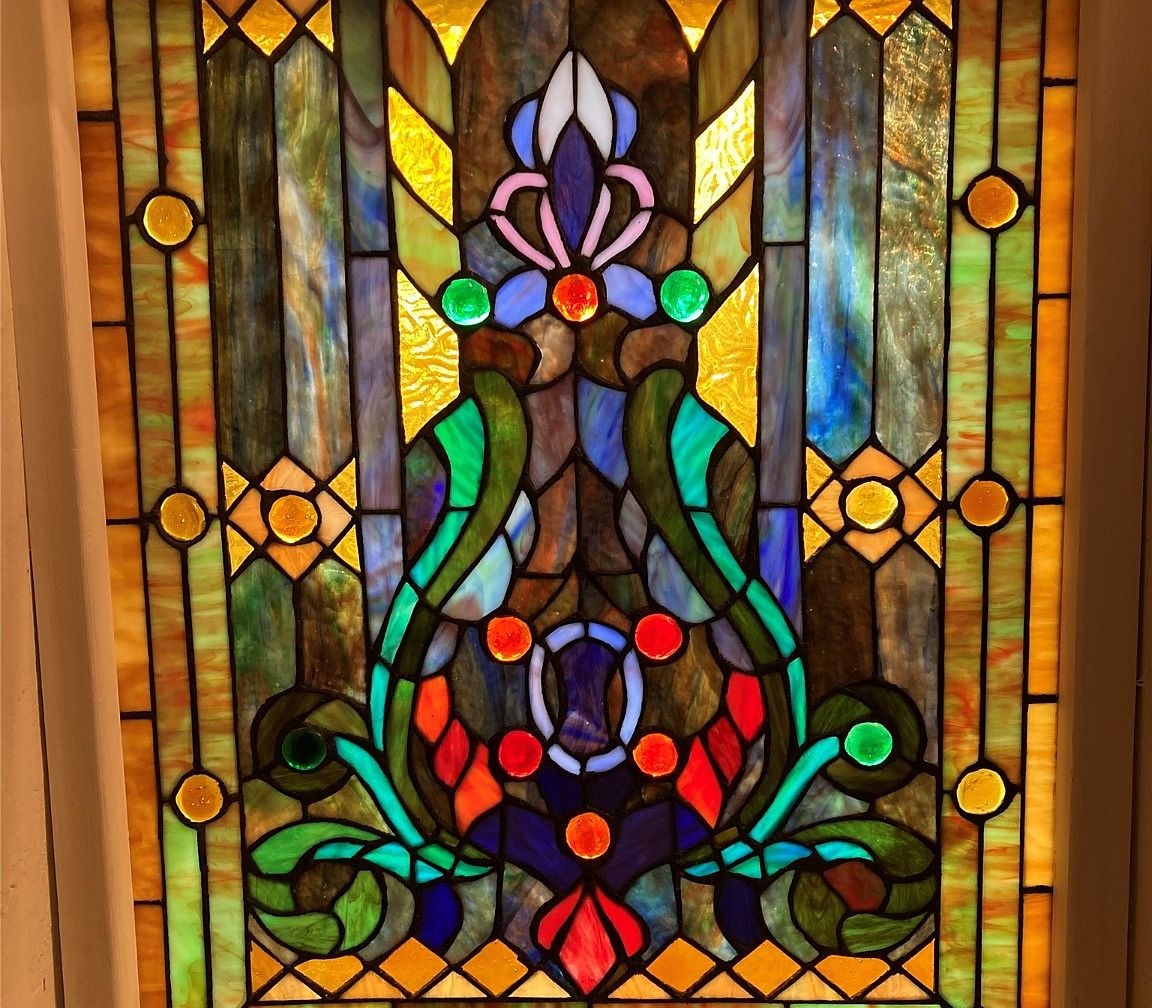 This stained glass window illustrates intricate artistry with vibrant colors. The design features a blend of greens, blues, reds, and yellows, showcasing floral patterns intertwined with geometric shapes. The glass pieces vary in texture, reflecting light differently, creating a luminous effect. A central motif is a stylized flower, surrounded by swirling vines, enhancing the organic theme. Each colored section is bordered by black leading, accentuating the details and providing a structured look. The warm hues of amber and gold contrast beautifully with cooler tones, illuminating the space and evoking a sense of elegance and nostalgia in the home.