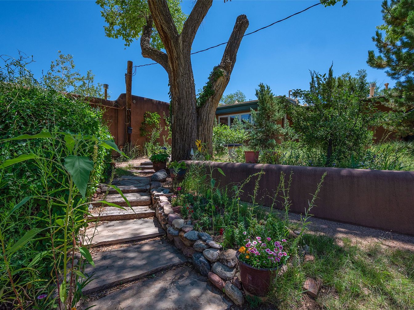 A charming garden pathway leads toward a historic home, bordered by lush greenery and colorful flower pots. The walkway, crafted from natural stone slabs, meanders gently, inviting exploration. Tall grasses and vibrant blooms add a sense of life. A large tree, its textured bark and sprawling branches, provides shade and character. The soft earthy tones of the home’s adobe walls blend seamlessly with the landscape, emphasizing a harmonious relationship with nature. Sunlight filters through the foliage, creating dappled shadows along the path, enhancing the serene, tranquil atmosphere of this picturesque outdoor space.