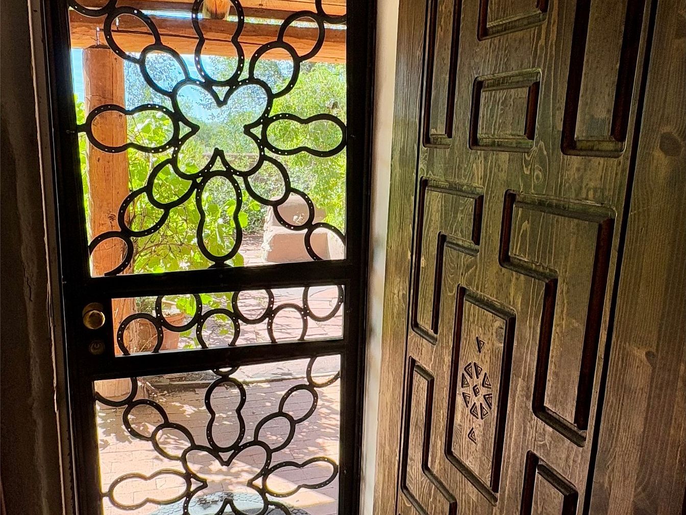The image shows an entrance doorway featuring intricate wrought iron details and a solid wooden door. The wrought iron screen has a floral motif, allowing natural light to filter through while providing some privacy. The wooden door has a deep, dark finish with geometric carvings that add texture and interest. Sunlight streams in, illuminating the space and casting shadows on the floor. Surrounding the entryway, rustic wooden beams and greenery from outside enhance the welcoming feel. The earthy tones of the wood contrast beautifully with the ornate ironwork, creating an inviting yet elegant atmosphere.