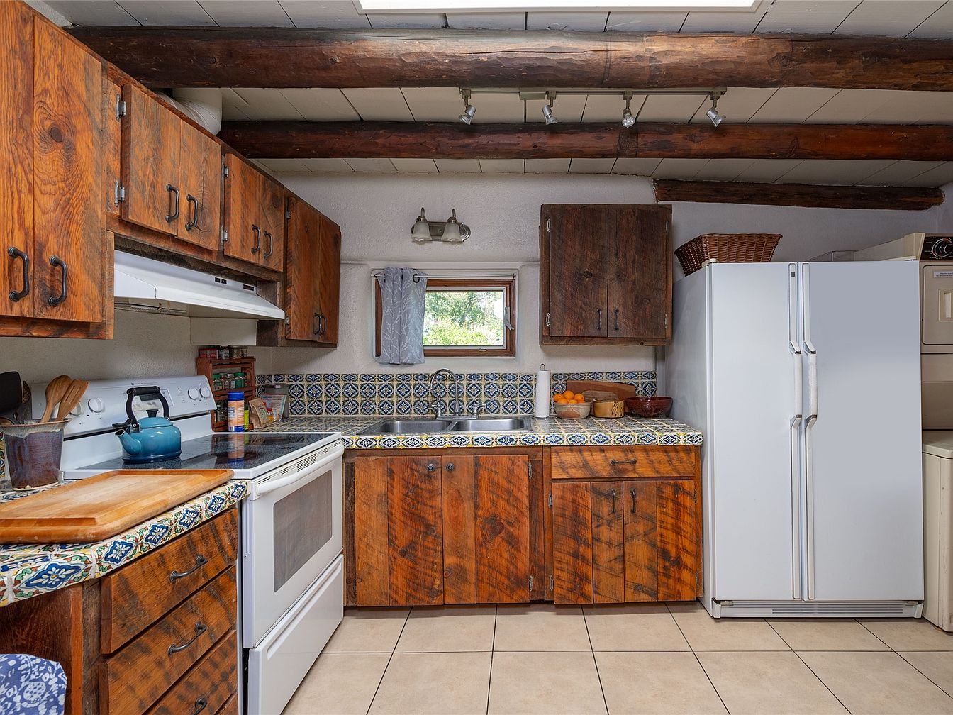 The kitchen features rustic wooden cabinetry, showcasing rich, grainy textures. Dark, weathered beams span the ceiling, contrasting with the lighter wall color. A cleverly designed tile backsplash displays intricate blue and yellow patterns, adding vibrancy above the countertop. Essential appliances, including a white stove and a large fridge, offer modern convenience amidst the vintage aesthetics. A small window brings in natural light while offering a view outdoors. The flooring consists of neutral beige tiles, accentuating the warmth of the wooden surfaces. Functional kitchen items, including a kettle and cutting board, are neatly arranged to enhance the cozy atmosphere.