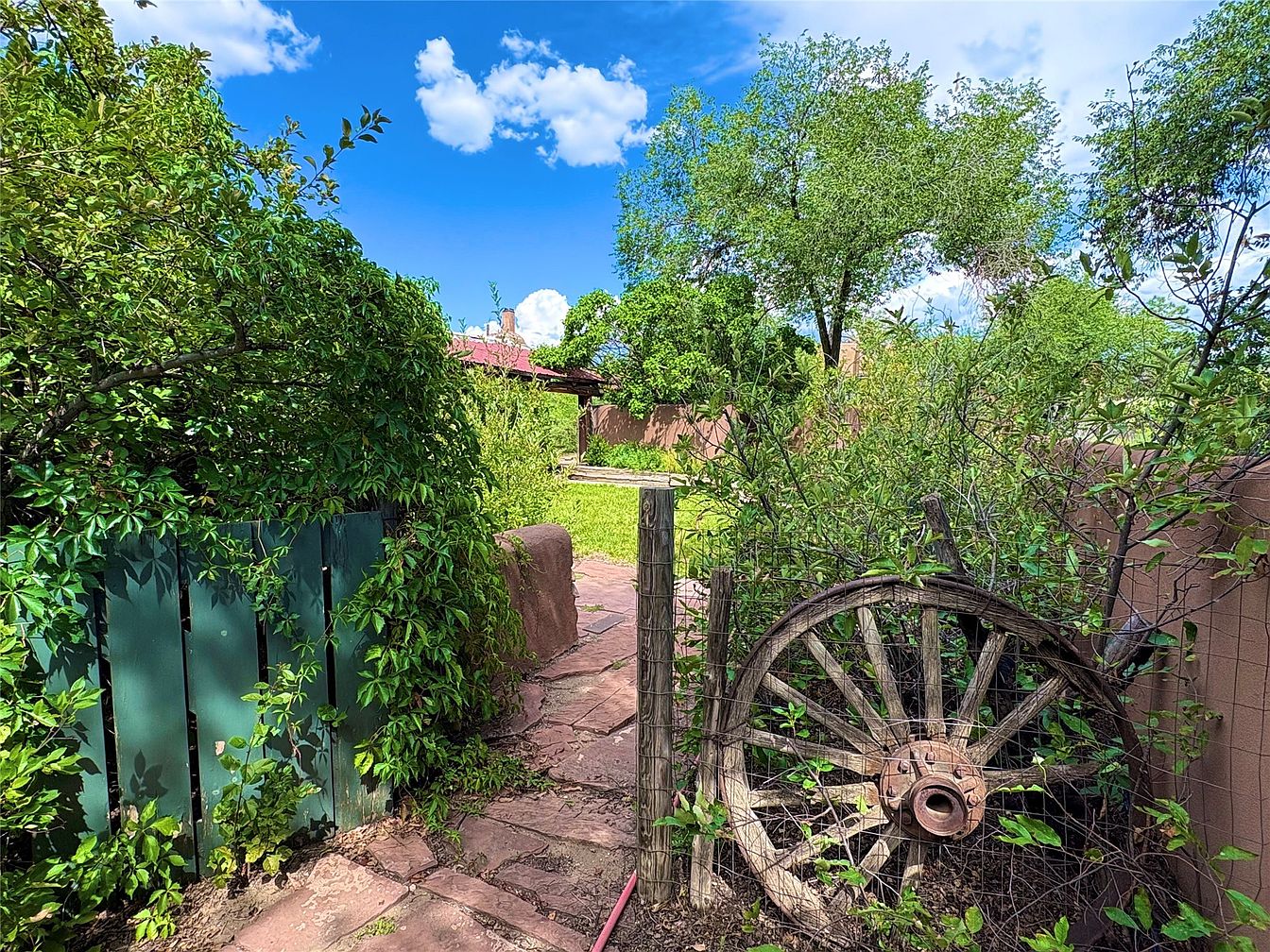 A rustic garden entrance welcomes visitors with a weathered wooden wheel partially hidden among lush greenery. The space features a charming green wooden gate, slightly ajar, surrounded by vibrant, leafy plants. A winding stone pathway guides toward a sunlit yard, where bright green grass contrasts beautifully against earthy tones of the adobe walls in the background. Towering trees and vibrant foliage add layers of texture, enhancing the serene atmosphere. The open sky above, adorned with fluffy white clouds, contributes to a tranquil setting, evoking a sense of nature’s embrace in this enchanting outdoor space.