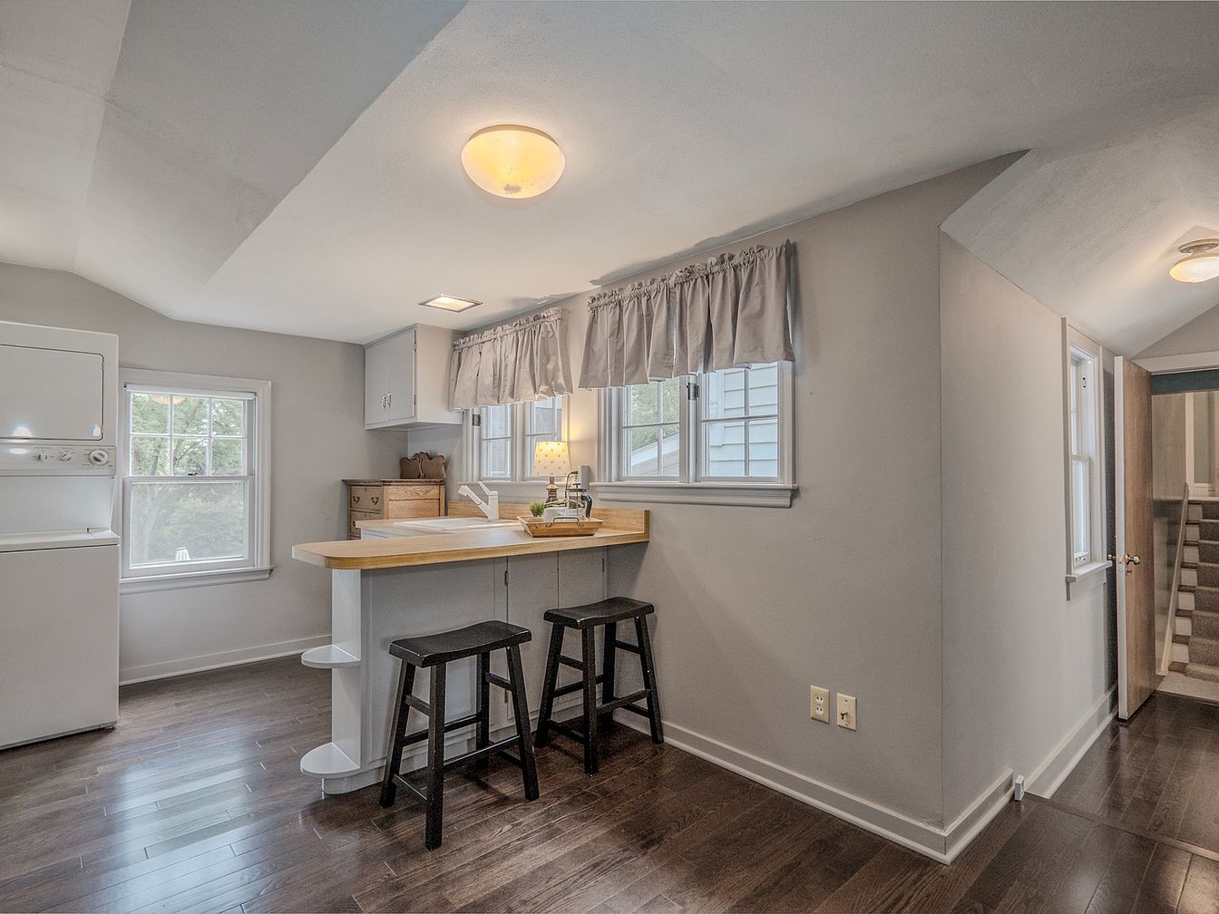 A cozy kitchen corner features a wooden breakfast bar with two black stools placed beneath it, set against a backdrop of soft grey walls and ceiling. Three windows let in natural light, adorned with light grey ruffled valances. In the background, a white stacked washer and dryer unit seats beside a window, and a small wooden dresser adds warmth. The countertop is lightly accessorized with a lamp and a tray. The floor is a rich, polished dark wood, offering warm contrast to the light neutral palette of the cabinetry and walls. To the right, a doorway leads to a stairway and hallway.