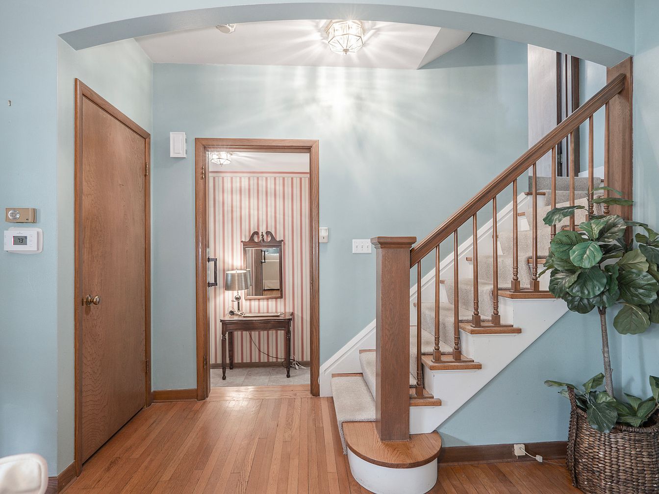 An inviting entryway with a classic staircase occupies the right side, featuring stained wooden handrails and balusters along with light beige carpeting on the stair steps. Soft blue painted walls contrast gently against the natural wood trim of doors and baseboards. A light fixture set in the ceiling provides a warm glow. To the left, a large wooden door integrates seamlessly with the wall. Straight ahead through a doorway is a glimpse of another room with striped wallpaper, a small dark wood table, a table lamp, and a decorative wall mirror, adding depth and character. A large green potted plant sits on the right in a woven basket, adding a lively touch.