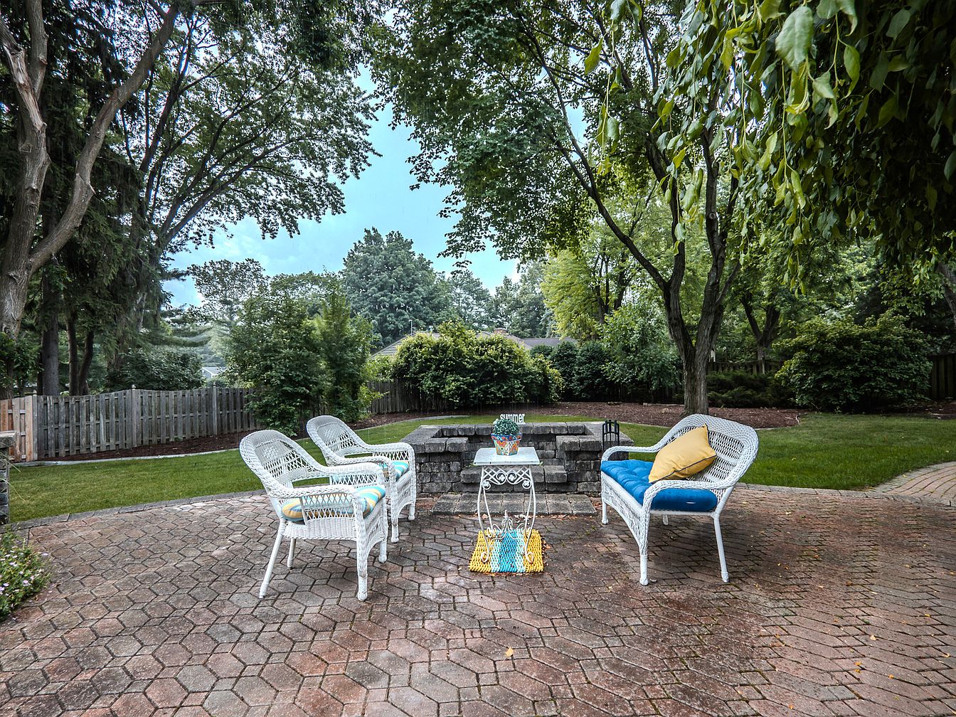 Wicker patio furniture, including a love seat, two armchairs, and a small side table, is arranged in a circle on a red brick patio that curves into a lush backyard. The seating is topped with plush cushions in crisp blue and cheerful yellow, adding vibrant pops of color against the white wicker. The table hosts a decorative summer sign, a vase of colorful faux flowers, and a lantern. Surrounding the patio are well-kept lawns, mature trees with overhanging branches, and a backdrop of thick shrubbery and wooden fencing, creating a private and inviting outdoor living space.