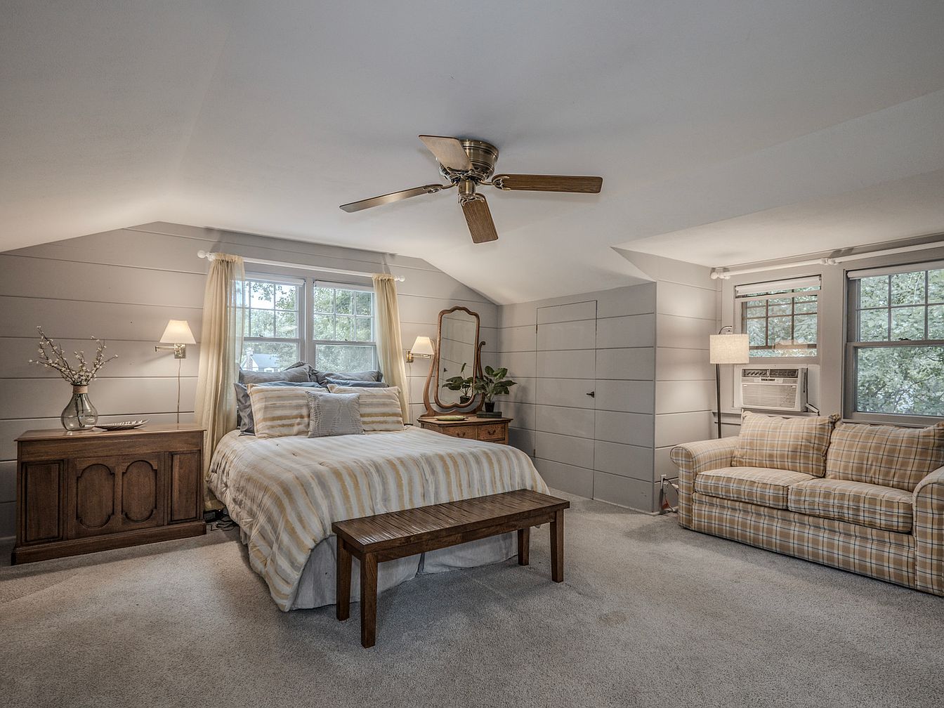 This is a cozy, upstairs bedroom featuring a sloped ceiling and soft gray paneled walls. The queen-sized bed sits beneath a pair of windows dressed in sheer, cream-colored curtains, with a matching striped bedspread and pillows. Each side of the bed has a wooden nightstand, one with a mid-century mirror and a leafy green plant. A wooden bench stands at the foot of the bed. On the right, a windowed wall hosts an air conditioner and a comfortable plaid loveseat in soft yellow and cream. Warm sconce and lamp lighting complement the welcoming, homey atmosphere.