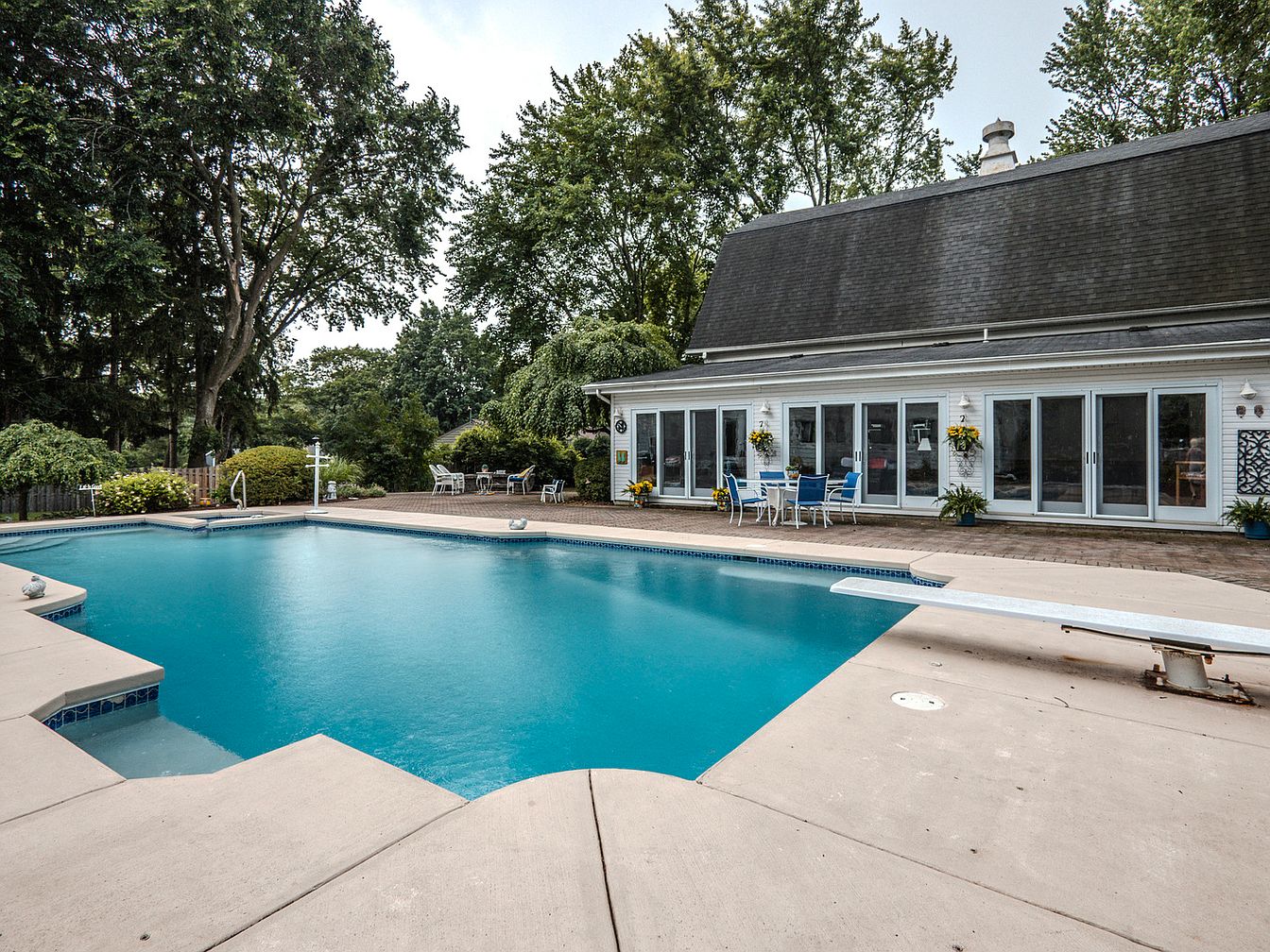 A spacious outdoor area featuring a large rectangular swimming pool surrounded by light concrete decking. On one side, there is a house with a dark mansard roof and rows of floor-to-ceiling windows and glass doors, bordered by white frames. Several planters with flowers and potted shrubs accent the exterior, bringing color to the scene. Near the patio doors, a blue and white outdoor dining set offers a spot for relaxing or eating poolside. Mature trees create a natural leafy backdrop, offering privacy and shade, while additional seating areas are scattered throughout the brick-paved patio, evoking an inviting and elegant atmosphere.