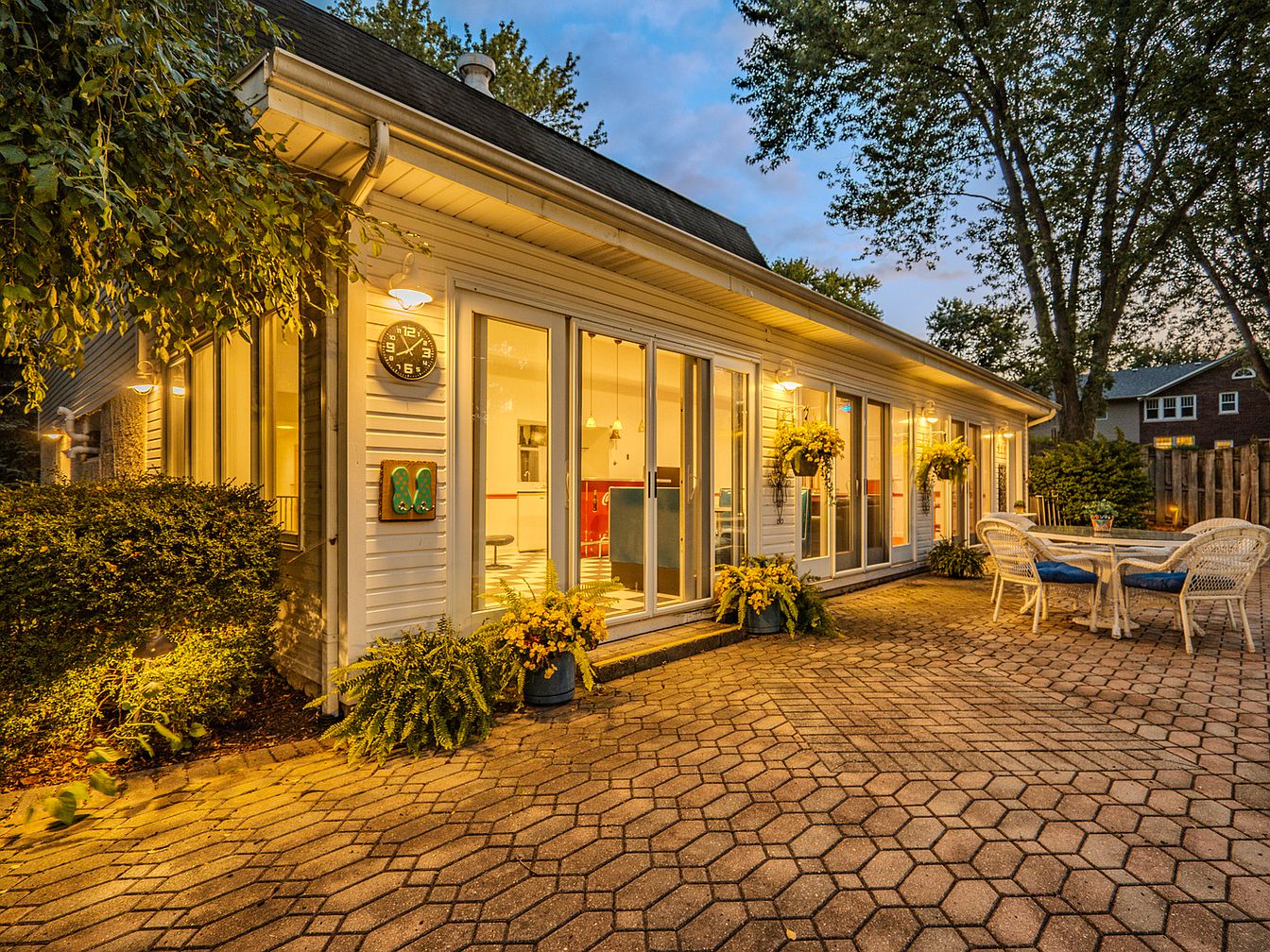 Expansive brick patio with hexagonal paving stones leads up to a bright row of floor-to-ceiling glass doors, creating a seamless transition between indoor and outdoor spaces. White siding and a deep eave roof characterize the house’s exterior, softly illuminated by vintage-style wall lights. Lush potted ferns and yellow flowers enhance the welcoming atmosphere, complemented by hanging baskets and neatly trimmed shrubs. To the right, a cozy seating arrangement features a white wicker table and chairs, inviting relaxation. The setting is shaded by mature trees, with warm ambient lighting and hints of color from the interior visible through the large windows.