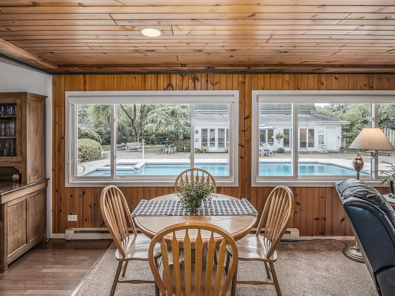 A cozy dining nook features a round wooden table with four matching chairs set atop a neutral carpet, blending seamlessly with the warm honey-toned wood paneling on the walls and ceiling. Large picture windows line the wall, offering an inviting view of the swimming pool and landscaped backyard, with a pool house and patio furniture visible outside. An elegant table lamp sits to the right, adding soft ambient light, while a classic wooden hutch on the left showcases glassware. The space exudes a rustic yet comfortable charm, with natural textures and earthy tones creating a welcoming, lived-in atmosphere.