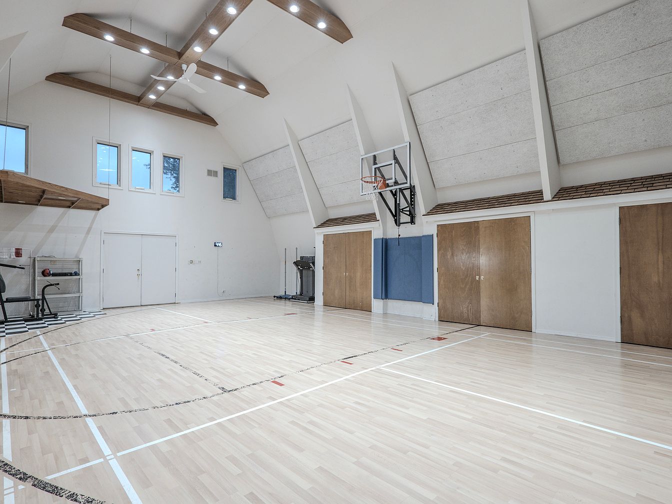 A spacious gymnasium area features a pale hardwood floor marked with basketball court lines. The walls are painted white, and tall, slanted ceilings are accented with exposed beams and inset lighting. Three large vertical windows and several wooden double doors line the right wall, providing entry and natural light. The basketball hoop is mounted on a reinforced wall with blue padding underneath. On the left, a small exercise nook holds gym equipment and a storage rack. The color palette emphasizes whites, light woods, and muted tones for a modern, airy atmosphere. The room feels both functional and inviting for sports activities.