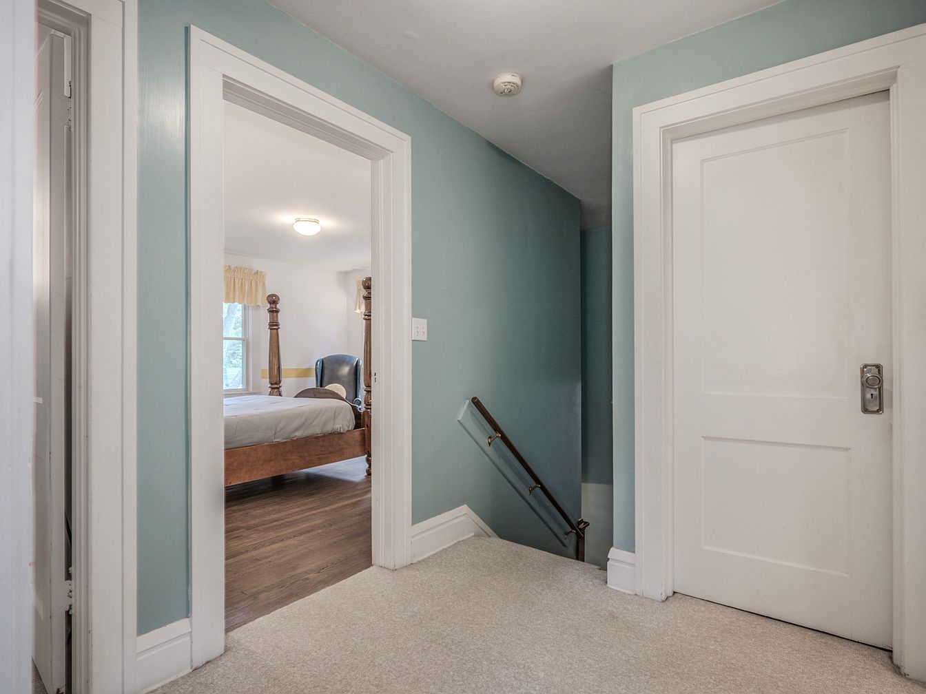 A small upstairs landing area with soft blue-green walls, white trim, and neutral light carpet underfoot. To one side, a simple stairway with a dark wood handrail descends to the lower floor. Two doorways are visible: ahead, a bedroom with a wooden four-poster bed, wood flooring, and a large window with sheer curtains, plus a deep blue armchair; to the right, a closed white door set in crisp white casing. The ceiling is white, and the space feels calm and airy, capturing a subtle historic charm through classic color tones and traditional details.