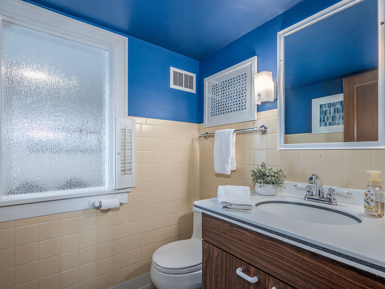 Compact bathroom with retro charm, featuring cream-colored tile on the lower walls contrasted by vivid blue paint on the upper walls and ceiling. The frosted glass window brings in diffused daylight above a classic toilet, with a chrome towel bar mounted on the wall. The vanity features wood laminate cabinetry, a white countertop, chrome faucet, and an oval sink. Decorative details include a small potted plant, rolled towels, and hand soap. A large mirror with a white frame reflects the light from a modern wall sconce, adding brightness and a sense of spaciousness to the small room.
