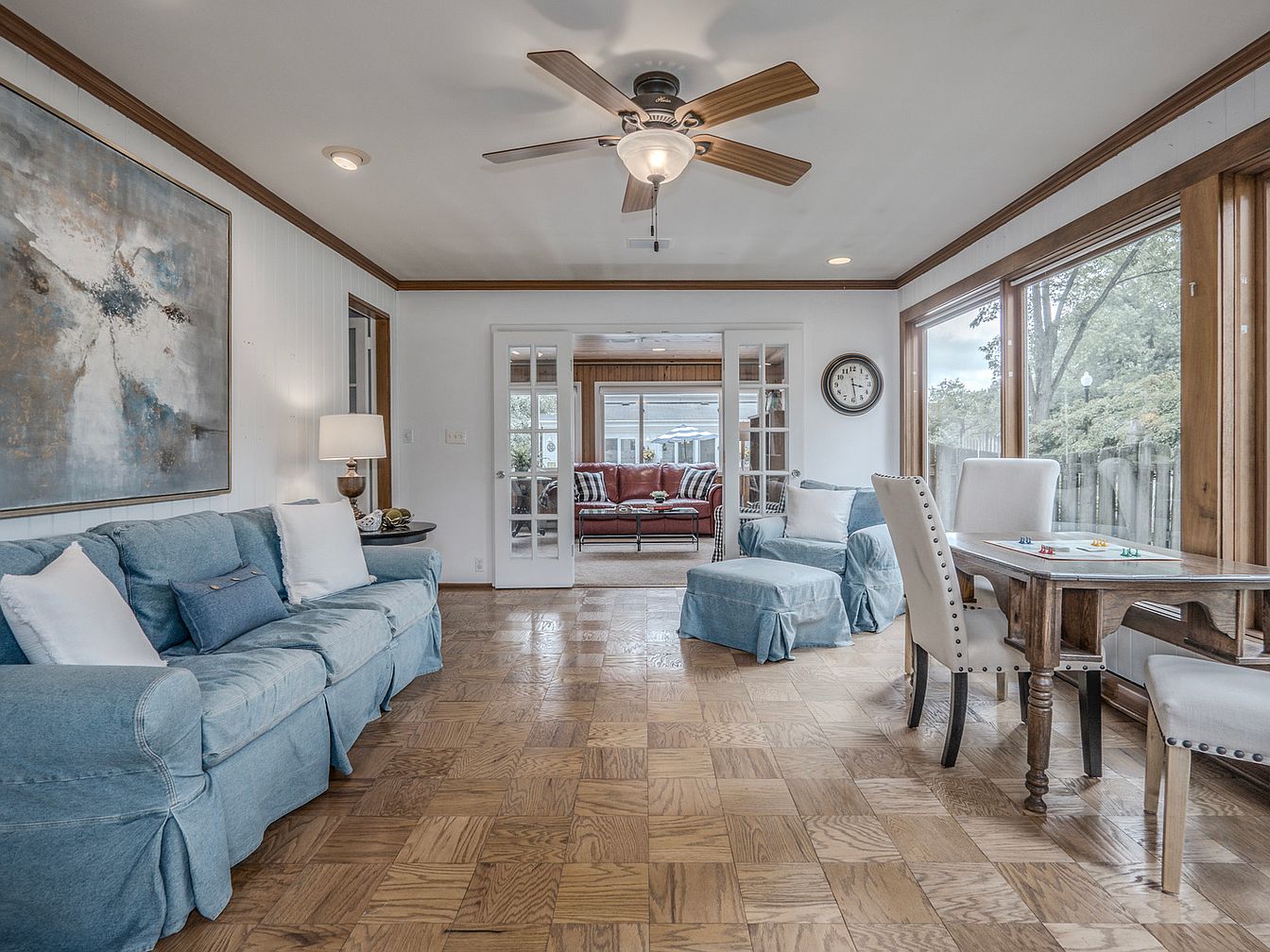 A spacious living room with a warm, welcoming aesthetic features light-stained parquet wooden flooring and large picture windows framed in natural wood, flooding the room with natural light. Soft blue slipcovered furniture, including a sofa and armchair with ottoman, creates a relaxed feel, complemented by crisp white accent pillows. A modern abstract painting in cool tones hangs on the white-paneled wall above the sofa. The ceiling is finished with a wooden crown molding that matches the window frames, and a central ceiling fan with lights adds functionality. At the far end, French doors lead into a cozy adjacent sitting room.