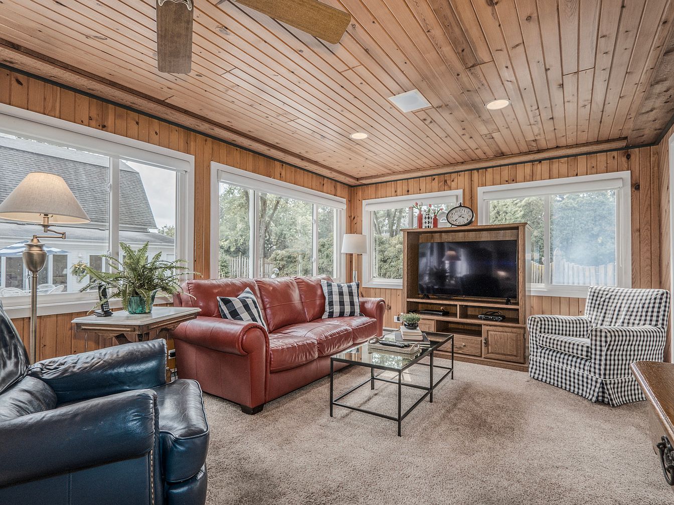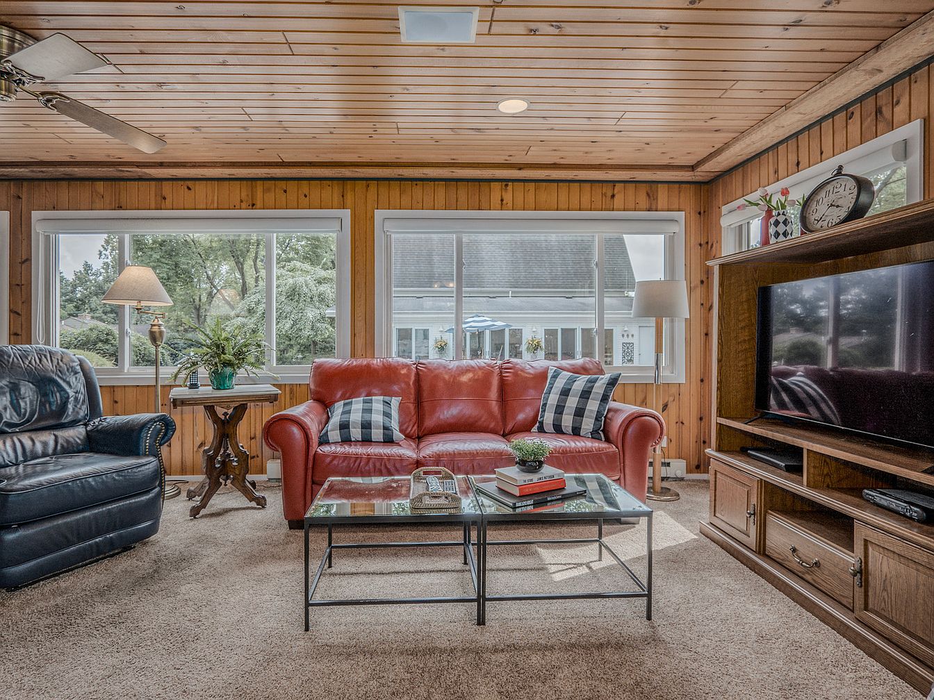 A cozy family room features a warm, rustic aesthetic with knotty pine wood paneling on the walls and ceiling, enhanced by recessed lighting and a modern ceiling fan. Large, white-trimmed windows fill the space with natural light, offering a clear view of mature trees and a neighboring roofline. Centered in the room sits a vibrant red leather sofa adorned with two navy and white plaid throw pillows. Flanking the sofa are a classic dark leather recliner and two elegant lamps with cream shades atop vintage wood side tables. A glass coffee table with metal legs holds stacked books and a small plant, while a wooden media unit with a large television completes the comfortable, inviting look.
