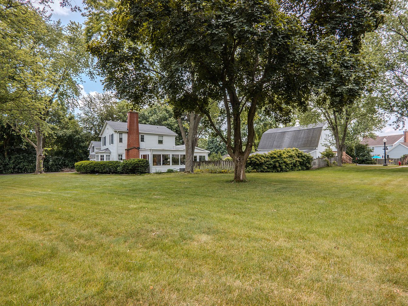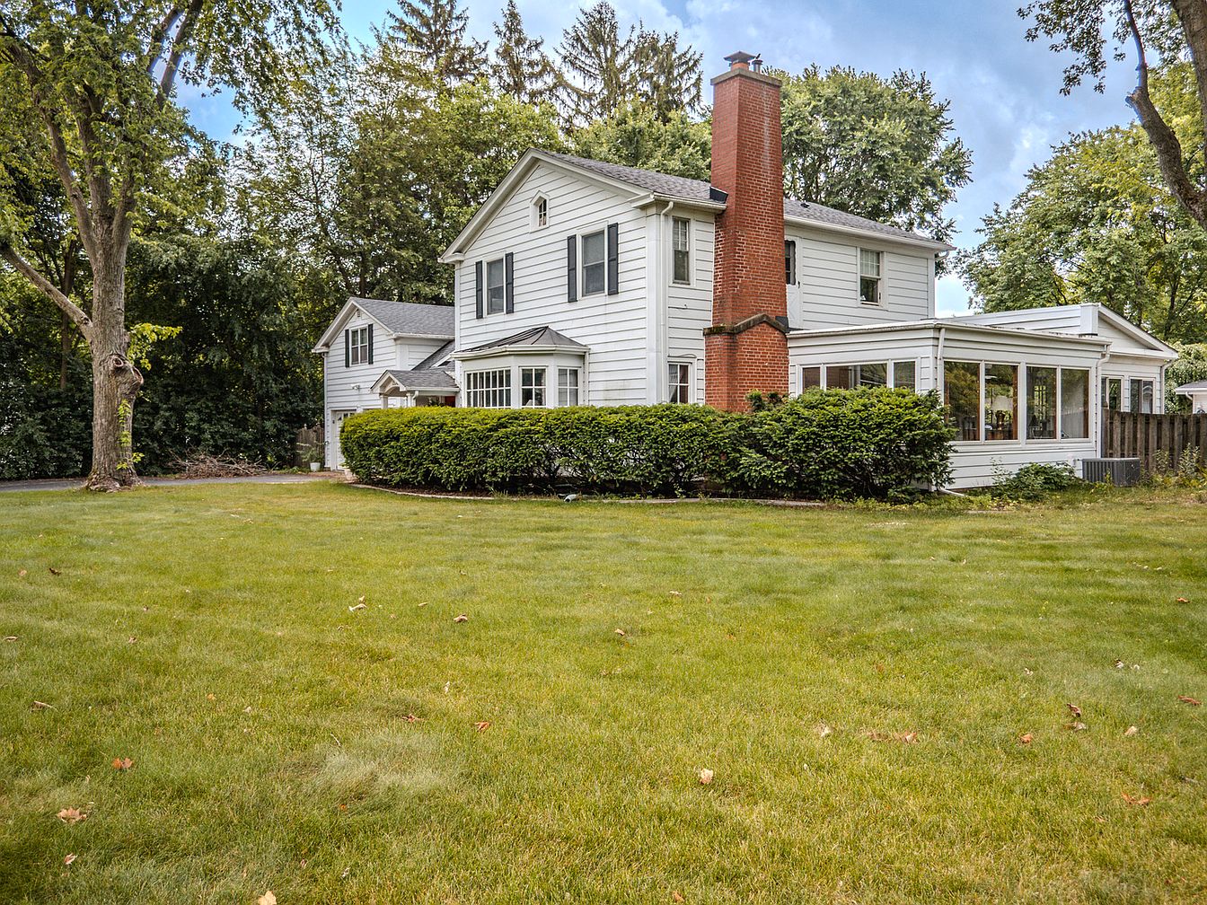 A two-story historic American home with white horizontal siding is positioned in the center of a lush green yard. The house features black window shutters and a striking red brick chimney. A sunroom with large windows extends from the right side of the home, blending indoor and outdoor living. Manicured green hedges line the home’s foundation, and mature trees frame the yard, providing a serene, shaded environment. The architectural style is traditional, with symmetrical window placement and a gable roof, giving the exterior a classic, timeless charm enhanced by the natural landscaping and spacious lawn.