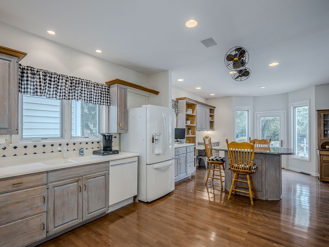 This space features an open kitchen layout with a central island and casual dining area. The cabinetry and island are finished in weathered, light-toned wood with gold-toned hardware, complemented by glossy hardwood flooring. Country-style touches include black-and-white gingham valances over the windows and matching tile accents along the backsplash. The roomy island doubles as a breakfast bar, with turned wooden spindle chairs surrounding it. Large windows and a glass door provide ample natural light and views of greenery outside, while recessed lighting and a distinctive ceiling fan add a mix of modern and vintage charm.