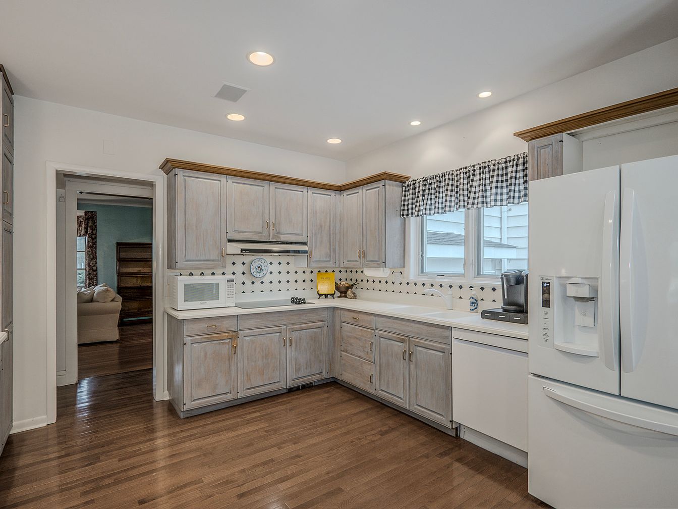 A spacious kitchen features a U-shaped counter layout with wood floors and whitewashed wood cabinets topped with crown molding. The backsplash displays diamond-shaped black accents along a crisp white background. Coordinated white appliances, including a large refrigerator and built-in dishwasher, maintain a clean look. Above the sink, two large double-hung windows bring in natural light and are dressed with black-and-white checked valances, adding a touch of country charm. The countertops, in simple white, offer plenty of workspace. Brass hardware and subtle decorative details create a blend of rustic and classic American style, complemented by recessed ceiling lights.