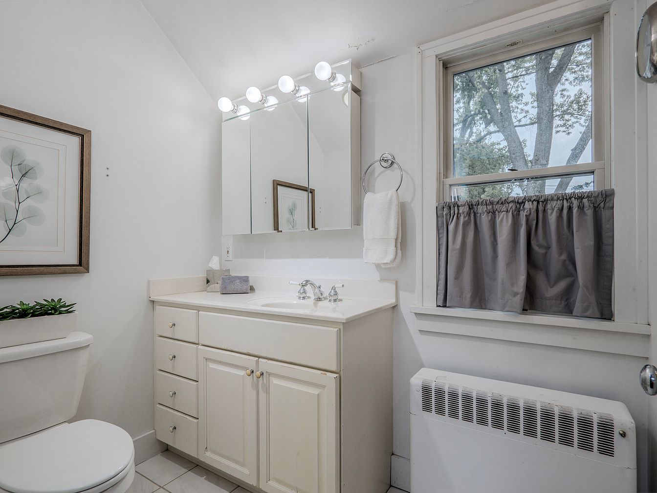 A compact bathroom featuring a white vanity with a single sink and polished silver faucet, topped by a mirrored medicine cabinet with six globe vanity lights above. The space feels bright and airy, with all-white walls and cabinetry complemented by sleek hardware. Natural light pours in through a window dressed in gray half curtains, offering privacy while still allowing daylight. A towel ring with a neatly folded white towel adds a touch of softness. Subtle decorative touches include a minimalistic botanical artwork in a wooden frame above the toilet and a small green plant accent on the tank, maintaining a clean and fresh ambiance.