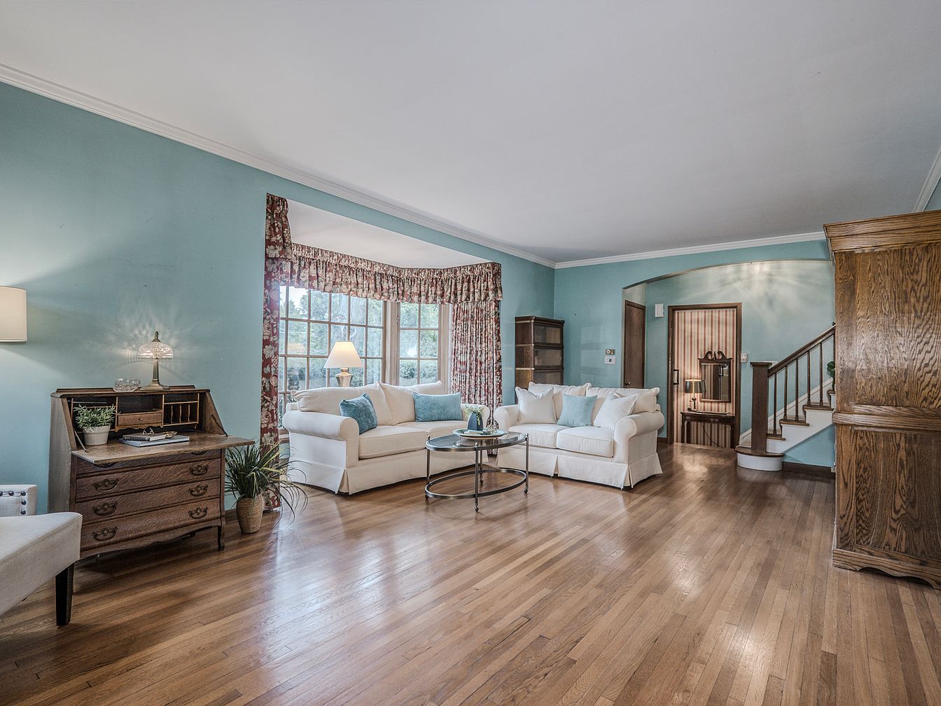 Spacious living room with light blue walls complemented by white crown molding. The hardwood floor is a medium oak tone, adding warmth to the space. Two large cream-colored sofas with light blue accent pillows create a cozy seating area around a glass-topped coffee table. A bay window framed with red-patterned curtains lets in natural light, and a table lamp sits beside the sofa. In one corner, a vintage wooden writing desk displays a glass lamp and green potted plant. An open stairway with wood railings descends to one side, next to an arched doorway leading to another room with striped wallpaper.