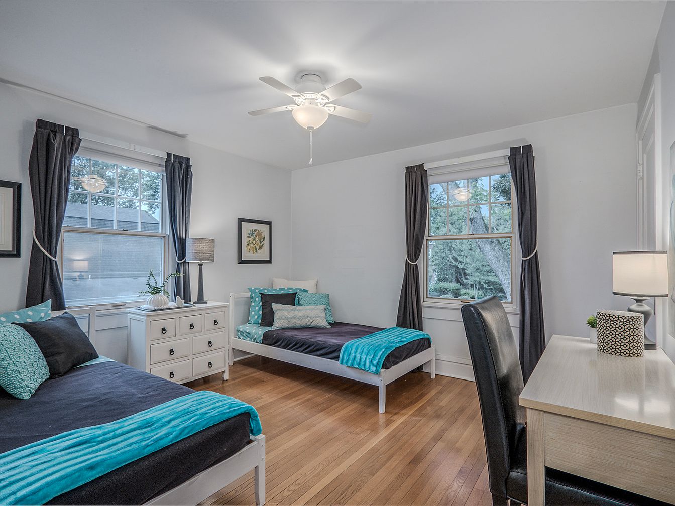 A spacious bedroom with two twin beds arranged along adjacent walls, each bed dressed with black and turquoise bedding and decorative pillows. Pale gray walls and white trim create a bright, clean backdrop, complemented by natural light from two large windows dressed with dark gray curtains. A white dresser with modern hardware sits between the beds, topped with a lamp and small decorative accents. At the right, a light wood desk with a black leather chair provides a workspace, completed with a modern lamp and small plant. Warm-toned hardwood flooring adds an inviting touch to the room’s overall calm and contemporary feel.