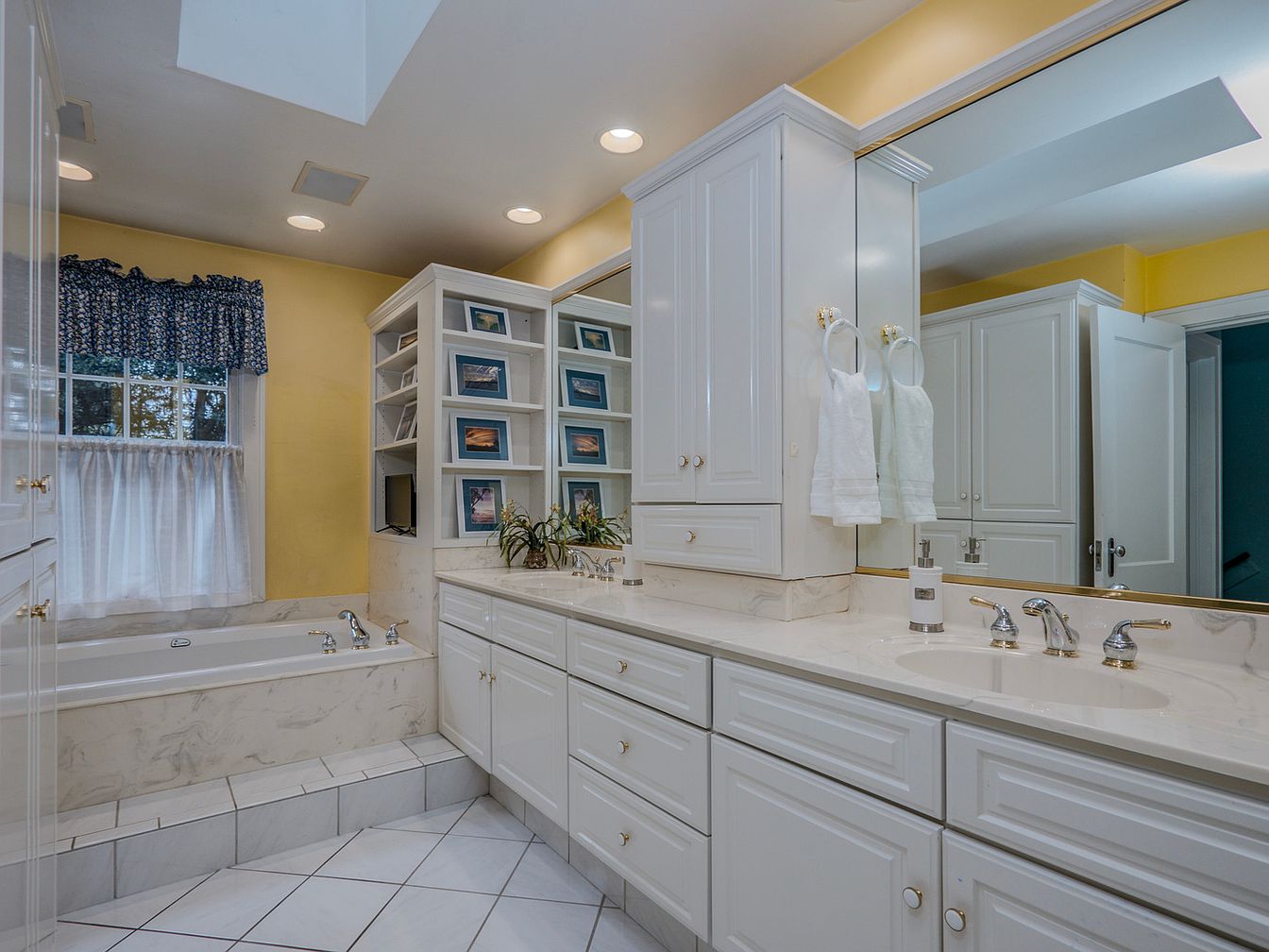 Spacious bathroom featuring a long marble countertop with double sinks and polished chrome faucets. White cabinetry lines the walls, complemented by gold-tone hardware for a classic, elegant look. A large mirror extends the length of the vanity, reflecting the soft yellow walls and enhancing the room’s brightness. Built-in shelving above the bathtub displays framed seascape photographs and small plants. The bathtub is encased in marble, set beneath a curtained window with blue floral valance, inviting ample natural light. Recessed lighting in the ceiling adds a modern touch, while the white tile floors tie together the room’s airy, traditional feel.