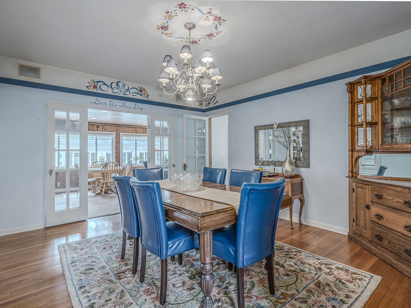 Central to the space is a large wooden dining table surrounded by six striking blue leather chairs, set atop a floral-patterned area rug. The wooden floor adds warmth, while the classic hutch and sideboard offer additional storage and vintage appeal. Light blue walls are contrasted with a decorative blue and floral border along the ceiling, which is further accentuated by a floral hand-painted chandelier medallion. A glass chandelier hangs above the table, casting soft light. French doors with glass panes open to a sunroom, blending traditional elements with bright, airy ambiance and cozy, welcoming decor.