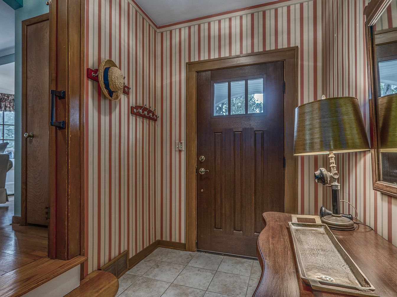 A cozy, inviting entryway featuring a wooden front door with narrow glass panels near the top, framed by classic striped wallpaper in shades of cream and muted red. To the left, a small step leads to another room with hardwood flooring and a partially visible interior. Wall-mounted hooks hold a straw hat and offer space for coats or bags. A vintage wooden console table sits along the right wall, topped with a tray and an antique-style lamp with an olive green shade, next to a rectangular mirror. The tile flooring complements the wood trim and adds to the welcoming, nostalgic ambiance.