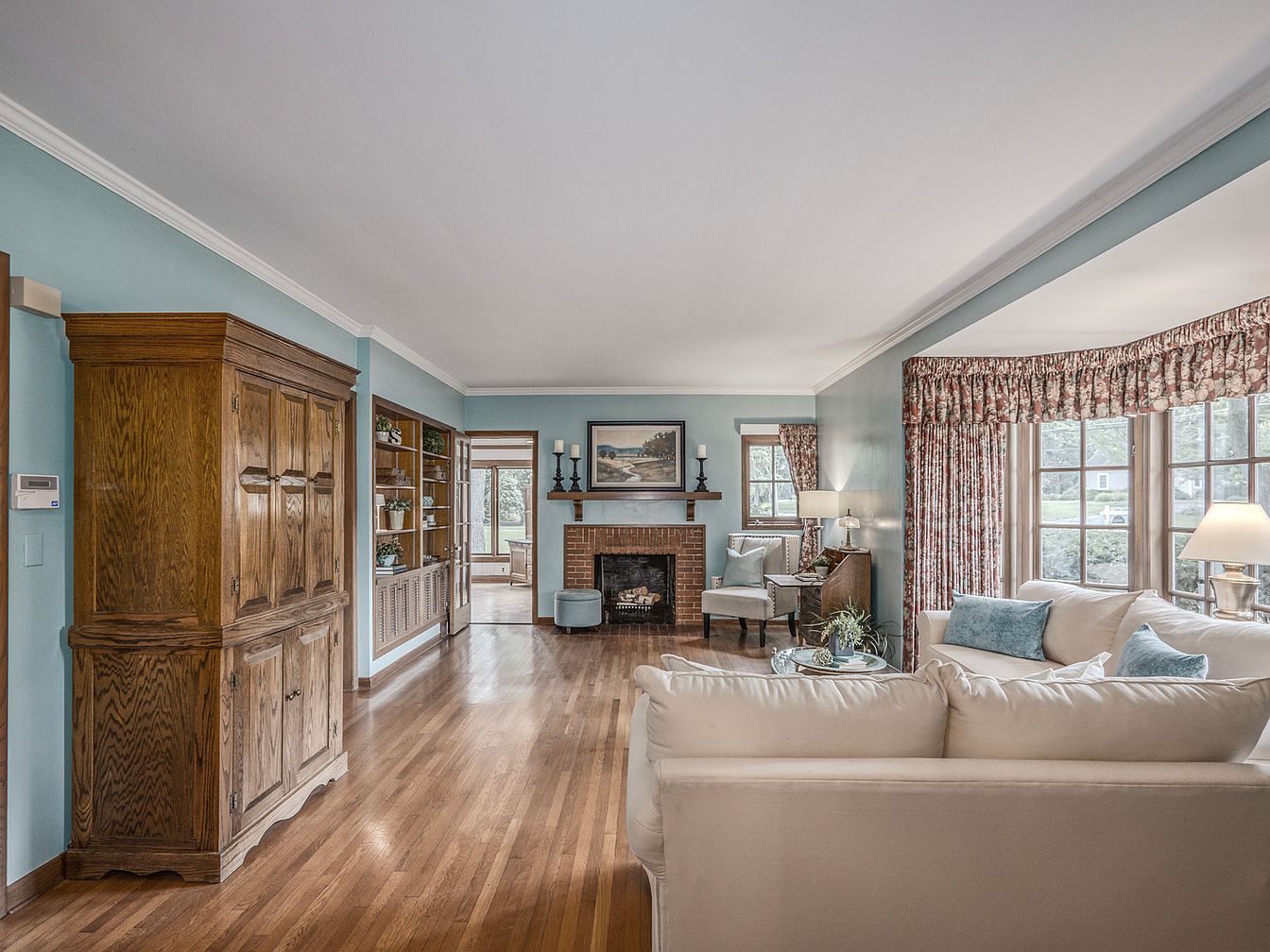 Spacious living room featuring pale blue walls, white trim, and glossy oak flooring. A white sofa with light blue pillows sits in the foreground near large front windows dressed with floral-patterned drapes and valances, filling the room with natural light. To the right, a cozy seating nook includes armchairs, a round ottoman, and a side table with a lamp. Centered on the far wall, a brick fireplace with a wooden mantle holds tall candlesticks and a landscape painting. On the left, an ornate wooden armoire stands beside a built-in bookshelf displaying neatly arranged decor and plants, contributing to a traditional, homey feel.