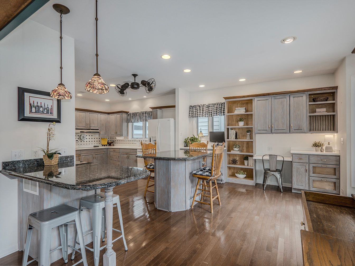 Spacious kitchen featuring light wood cabinetry with a weathered finish and open shelving for airy storage. The dark granite countertops contrast with the pale cabinets and sit atop a large island with integrated breakfast bar seating, including gray and wooden stools. Decorative pendant lamps with stained glass-style shades hang above the island, reflecting warmth. The hardwood floors add richness and warmth to the space. A built-in desk area with shelving offers a dedicated workspace. Checked valances on the windows add a touch of vintage charm, while understated potted plants and framed art provide homely accents.