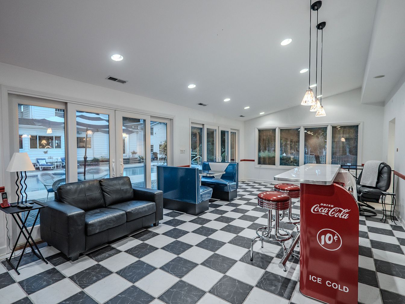 A spacious room with black and white checkered tile flooring, evoking a vintage 1950s diner atmosphere. On the left, a black leather couch sits beside a small table with a classic lamp and red telephone. The central feature is an authentic-style soda fountain counter with red chrome stools and a retro Coca-Cola advertisement on the front panel. Blue vinyl diner booths with white tables line the windowed wall, offering views of a pool and patio outside through large sliding glass doors. The room is well-lit with recessed lighting and pendant lights above the counter, and finished with clean white walls and red trim accents.