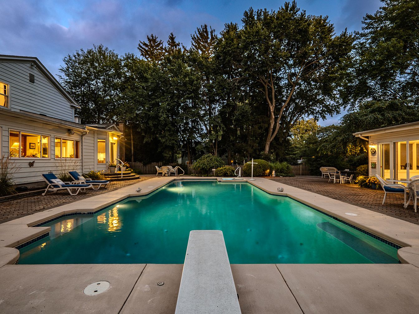 A large rectangular swimming pool sits at the center, its clear turquoise water reflecting ambient evening lights. Cream-colored concrete surrounds the pool, with a diving board at the near end. On the left, two reclining lounge chairs with blue cushions rest on a patterned brick patio, adjacent to the house featuring classic white siding and warmly lit windows. On the right, additional seating—wicker chairs and a small table—creates a cozy, inviting nook. Mature, leafy trees border the yard, providing shade and privacy, while garden beds accent the peaceful setting. The space radiates comfort and is ideal for relaxation and entertaining outdoors.