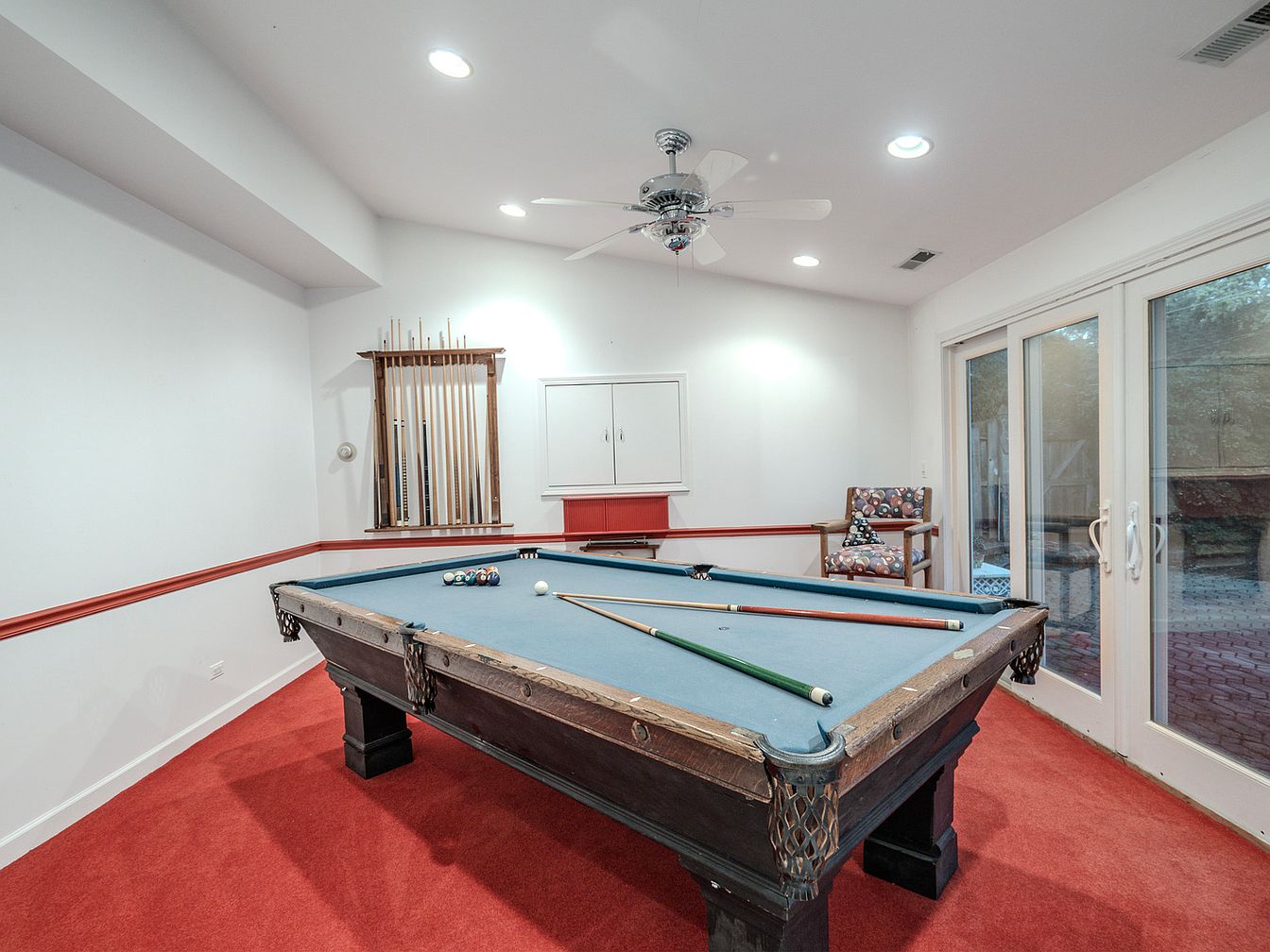 A spacious recreation room features a classic pool table with a blue felt surface positioned at the center atop bold red carpet. The walls are painted crisp white, accented by a narrow red chair rail running along the perimeter. On the left, cue sticks are neatly organized on a wooden rack mounted to the wall. A patterned armchair with playful circular motifs sits by the far wall, facing large sliding glass doors that fill the space with natural light and open to a brick patio outside. Ceiling lights and a silver ceiling fan add to the comfortable, inviting atmosphere.