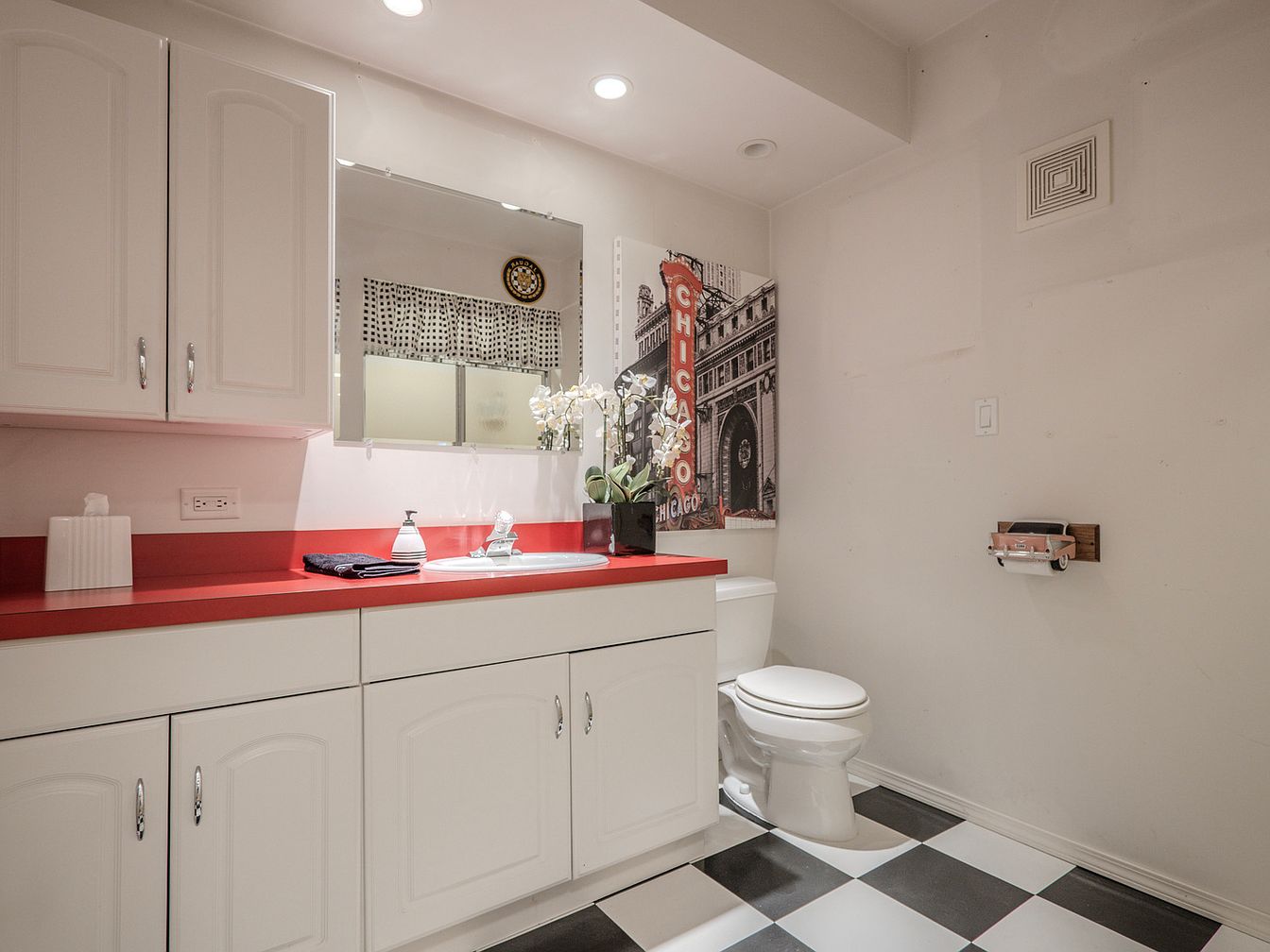 A spacious bathroom features a bold red countertop atop white cabinetry with polished chrome handles. The sink area is complemented by a large rectangular mirror, with a black-and-white Chicago-themed artwork propped against the wall beside a blooming orchid in a glossy planter. Overhead recessed lighting bathes the room in a gentle glow, while the checkerboard black-and-white tile floor adds a retro touch. A wall-mounted tissue box and a whimsical classic car-style toilet paper holder bring in quirky personality. Crisp white walls and upper cabinets provide a clean look, making the red surface and monochrome floor the standout design elements.