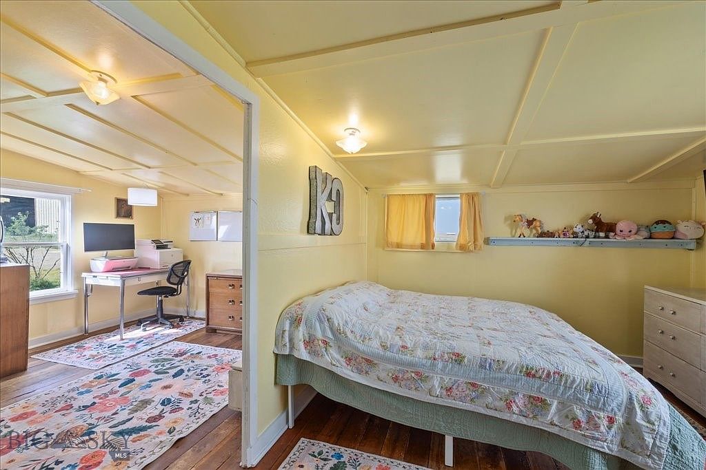This cozy bedroom features warm yellow walls and a cheerful ambiance, enhanced by a well-lit ceiling with soft lighting. Centrally positioned is a neatly made bed adorned with a delicate floral quilt, inviting a sense of comfort. To the left, a sleek wooden desk with an ergonomic chair provides a functional workspace, complemented by a computer setup and storage boxes above. The rustic wooden floor adds charm, while the playful area rug introduces vibrant floral patterns, echoing the bedspread. A small shelf displays an assortment of plush toys, adding personality to the room, and gentle curtains filter the natural light.