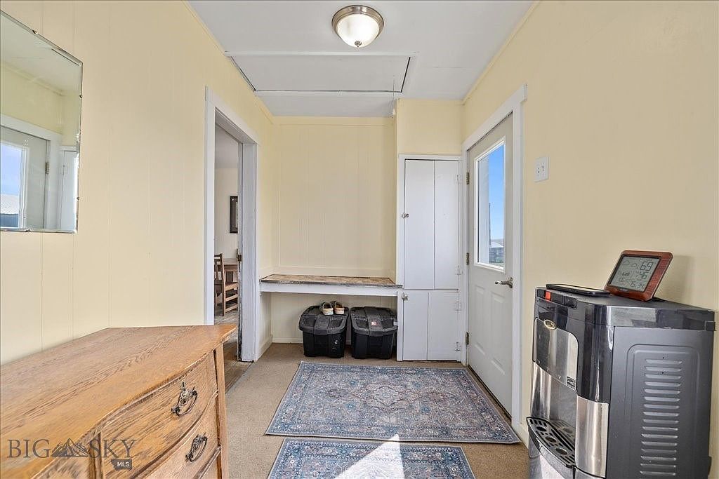 The mudroom features soft yellow walls that create a warm and inviting atmosphere. A distinct patterned area rug covers a portion of the floor, complementing the rustic wooden furniture, which provides a sturdy place for storage. Along the walls, there are hooks laden with various coats and hats, showcasing a practical design element. To the left, a water cooler offers convenience. The two windows allow natural light to flood the space, enhancing its brightness and visibility of the outdoor setting. Architectural details include a simple ceiling fixture that maintains the room’s cozy, functional vibe.