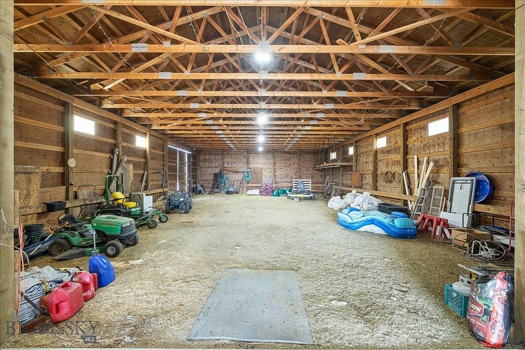 This garage features exposed wooden beams and a spacious, open layout. The high, slanted ceiling adds a sense of height and airiness. Natural light filters through multiple windows, brightening the space. The walls are lined with wooden paneling, creating a rustic feel, while the concrete floor is bare, showcasing functionality over aesthetics. A large wooden workbench occupies one side, accompanied by various tools and supplies, reflecting an organized workspace. On the opposite wall, storage bins and equipment like saddles and barrels are neatly arranged, contributing to a practical and efficient atmosphere suitable for hobbies or home projects.