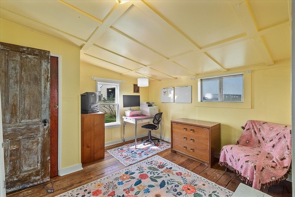 This cozy home office features a warm yellow color scheme that enhances the space’s brightness. The room boasts a textured wooden door, contributing to its rustic charm. A functional desk holds a computer with a pink accent and a black office chair, while whiteboards are mounted for note-taking. Natural light streams through the small window, illuminating the room. The wooden flooring adds a touch of warmth, complemented by a brightly patterned rug with floral motifs, providing a cheerful contrast. A low wooden dresser rounds out the furnishings, and a pink throw blanket on the chair adds comfort and style.