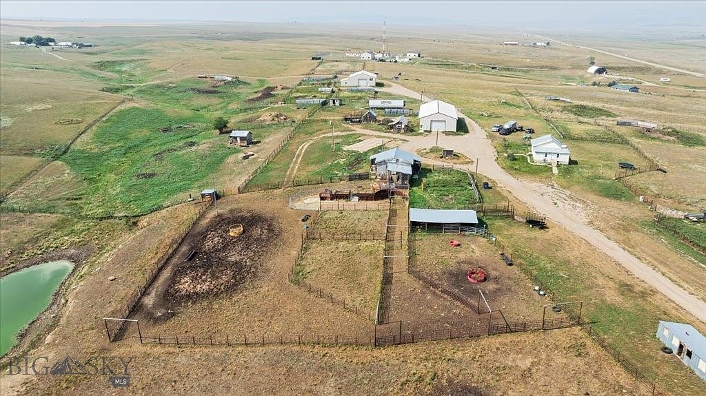 This aerial view displays a sprawling property set in a wide-open landscape. The terrain is primarily grassy with patches of brown, indicating areas of land use and cattle pens. A central dirt road meanders through several structures, including barn-like buildings and smaller residential homes with lightweight roofs. Fenced areas can be seen, illustrating functionality for livestock management. A small pond is positioned to the left, reflecting the greenery around it. This rustic setting evokes a sense of pastoral life, emphasizing spaciousness and agricultural use amidst the serene natural surroundings.