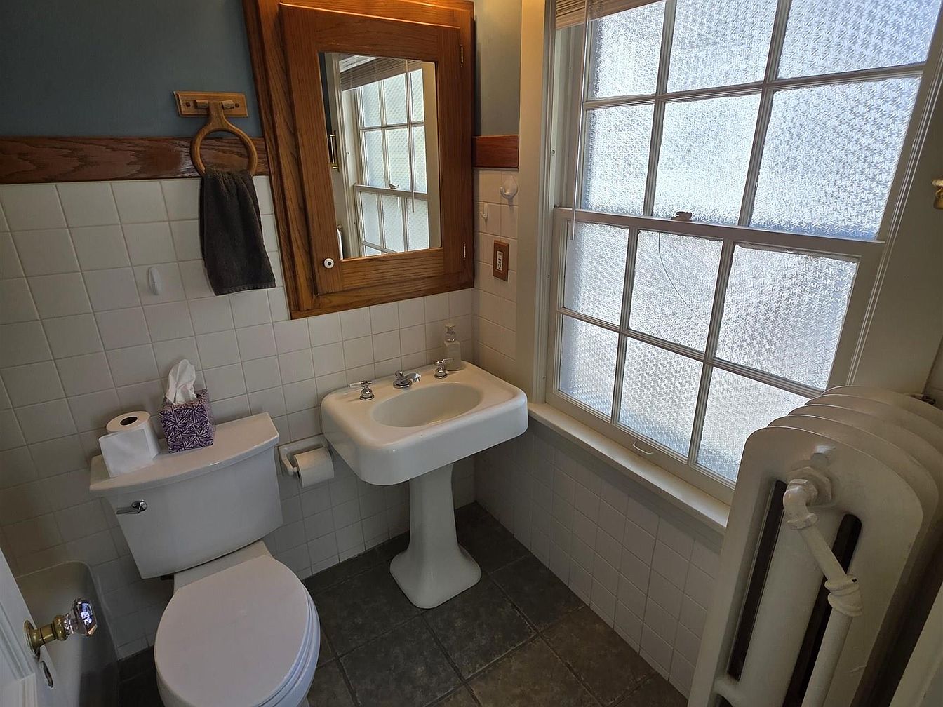 A compact, vintage-style bathroom featuring a pedestal sink with chrome fixtures and a classic white toilet beside it. The walls are partially tiled in white square tiles, topped with a medium wood trim that matches the wood-framed mirrored medicine cabinet above the sink. A single towel ring with a dark hand towel hangs on the wall. To the right, a large window with privacy-patterned glass lets in natural light, while a white cast iron radiator stands beneath the sill. Gray square floor tiles add depth, and simple touches like a tissue box and soap dispenser provide functionality.
