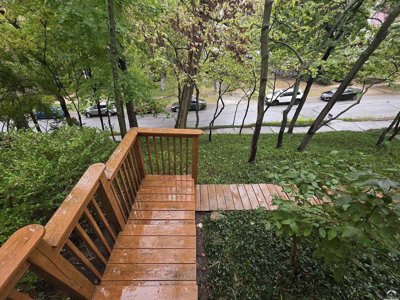 A wooden walkway bordered by a simple wooden railing leads down a slope surrounded by lush green vegetation and young trees. The wood appears freshly rained on, adding a glistening, natural look. The path gently descends toward a sidewalk and street, visible beyond the treeline where several cars are parked. The area feels secluded and tranquil due to the dense greenery, creating a peaceful barrier between the home and street. The overall atmosphere is serene and inviting, blending natural elements with a touch of rustic architectural charm.