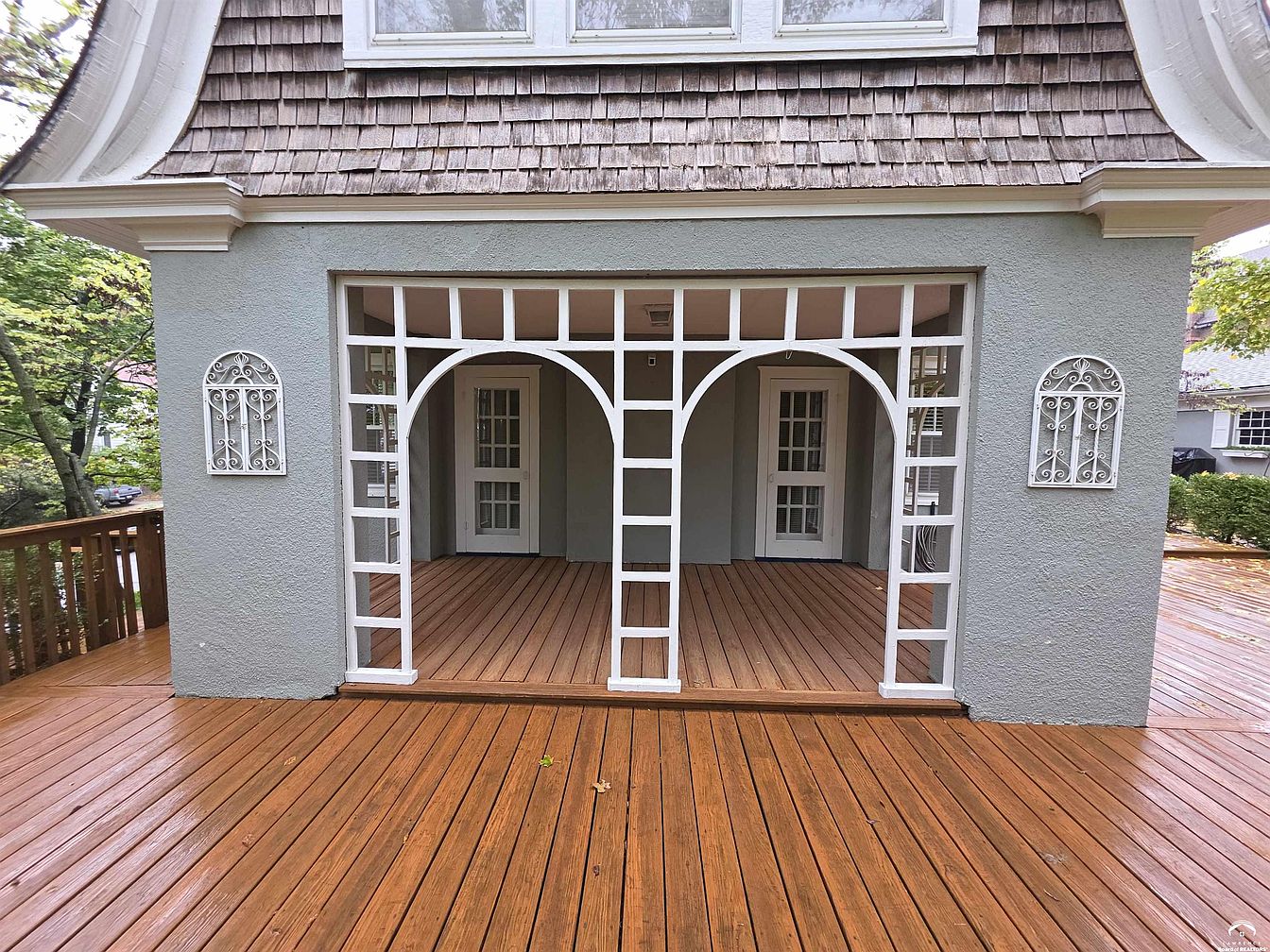 A covered wooden deck sits beneath a section of the house featuring a Gambrel roof with weathered cedar shingles and crisp white trim. Two large rectangular windows and a small arched window line the upper floor, letting in ample sunlight. An arched lattice entryway, painted white, leads onto the deck, paired with decorative wrought iron wall art. The muted green stucco walls complement the natural setting, while the deck is surrounded by a wooden railing and shaded by tall leafy trees. The space feels open, welcoming, and well-integrated with the lush outdoor landscape.