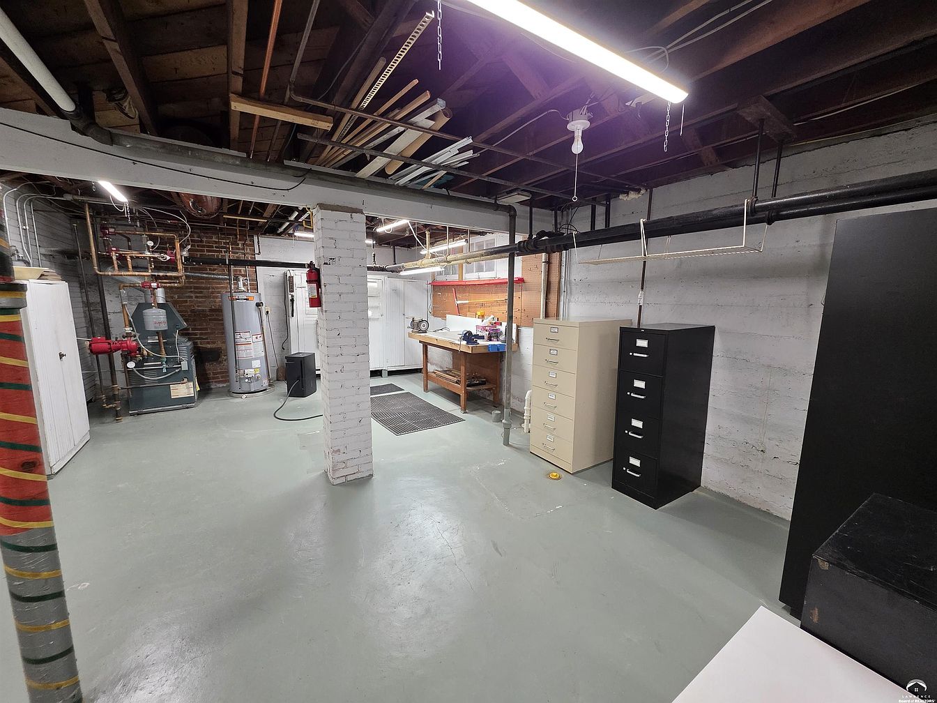 A spacious basement area with concrete floors and exposed ceiling beams, painted in neutral gray and white tones for a utilitarian look. The left side features a water heater and furnace unit near a white-bricked support column, hinting at the room’s dual purpose for utilities and work. Against one wall, two tall metal filing cabinets, beige and black, offer organized storage, while a wooden workbench is topped with a clutter of tools and supplies. Pipes, electrical wiring, and ductwork run across the ceiling, along with industrial fluorescent lighting that brightens the entire space. Walls are mostly unfinished with painted masonry surfaces.